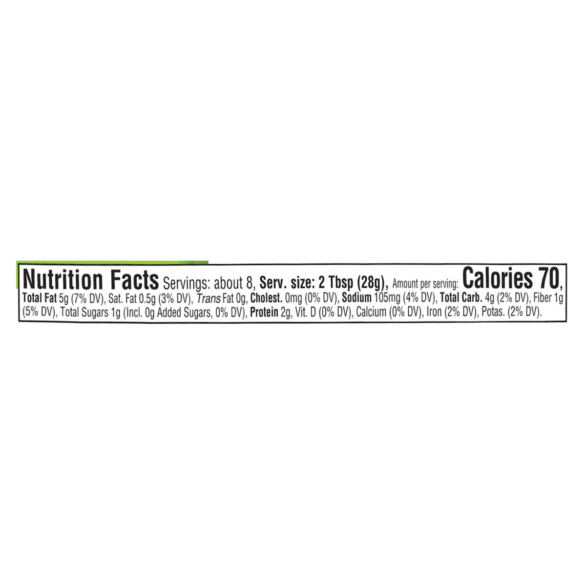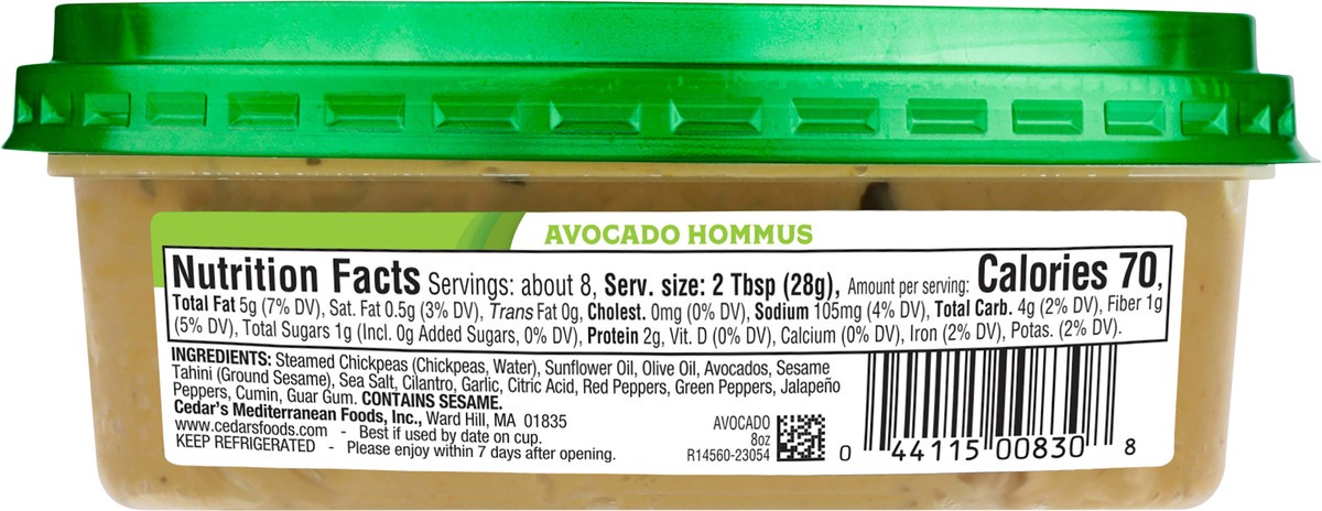 Steamed Chickpeas (Chickpeas, Water), Sunflower Oil, Olive Oil, Avocado, Sesame Tahini (Ground Sesame), Sea Salt, Cilantro, Garlic, Citric Acid, Red Peppers, Green Peppers, Jalapeno, Cumin, Guar Gum.