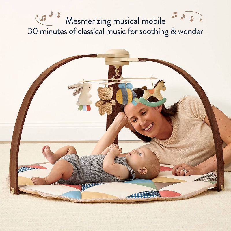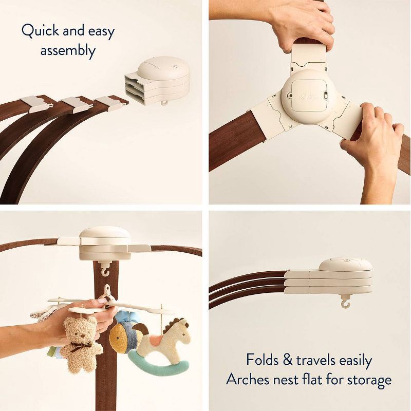 - An electronic musical mobile with plush hanging toys brings the fun while promoting early visual development, reaching, and batting,
