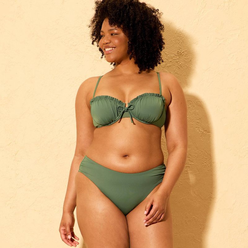 Create a stylish, streamlined swim look with this Side-Shirred Scoop High-Leg Full-Coverage Bikini Bottom from Shade & Shore™. This pull-on bikini bottom is fashioned in a green shade with a scoop-fro…