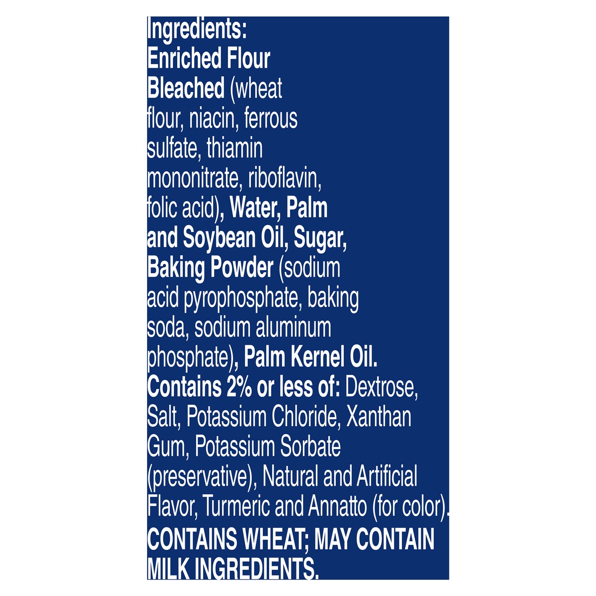Enriched Flour Bleached (Wheat Flour, Niacin, Ferrous Sulfate, Thiamin Mononitrate, Riboflavin, Folic Acid), Water, Palm and Soybean Oil, Sugar, Baking Powder (Sodium Acid Pyrophosphate, Baking Soda, …