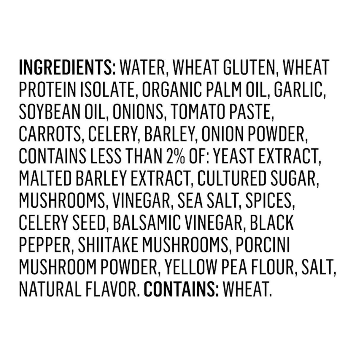 Water, Wheat Gluten, Wheat Protein Isolate, Organic Palm Oil, Garlic, Soybean Oil, Onions, Tomato Paste, Carrots, Celery, Barley, Onion Powder, Contains Less than 2% of: Yeast Extract, Malted Barley E…
