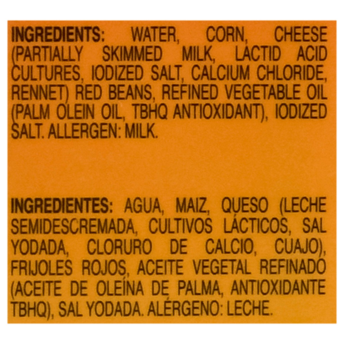 Water, Corn, Cheese (Partially Skimmed Milk, Lactid Acid Cultures, Iodized Salt, Calcium Chloride, Rennet) Red Beans, Refined Vegetable Oil (Palm Olein Oil, TBHQ Antioxidant), Iodized Salt.