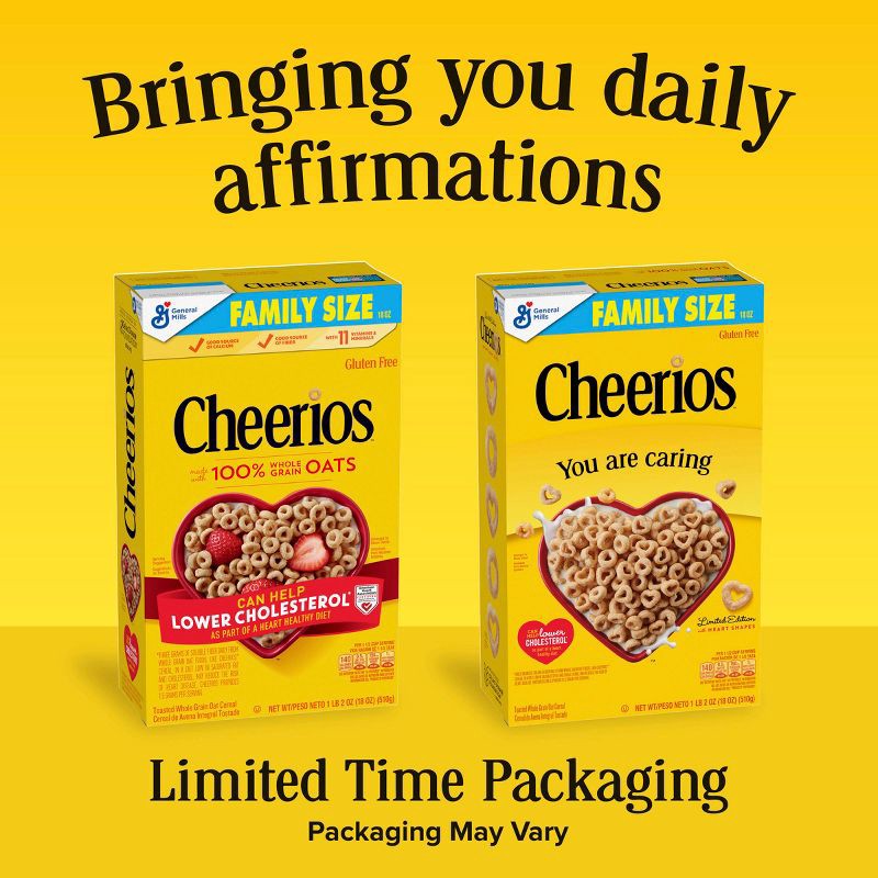 - CONTAINS: One cardboard box of crunchy Cheerios Cereal, Limited Edition Heart Shapes, Affirmations Box, Gluten Free, 8.9 oz; Perfect for instant snacking, or a part of breakfast and meals