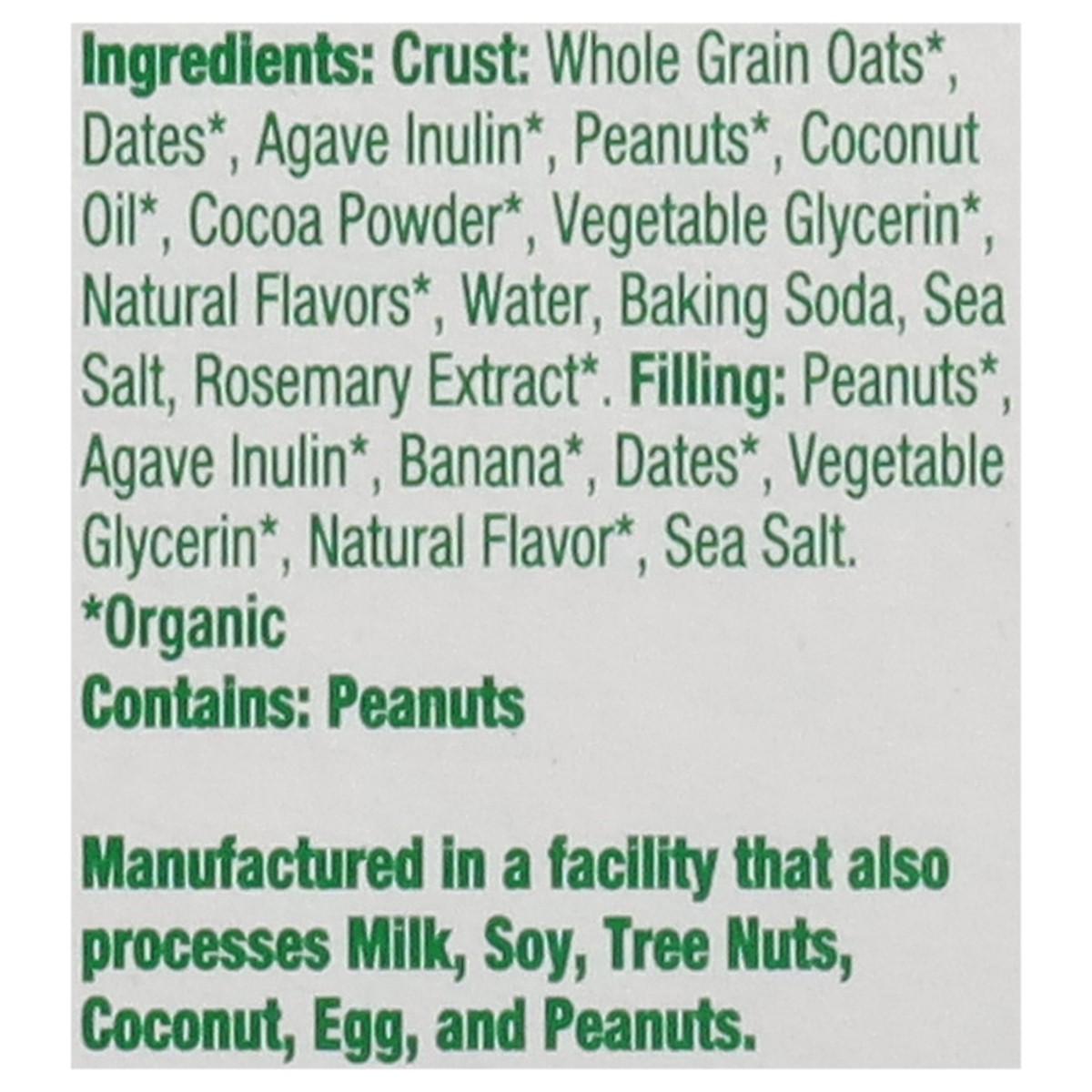 Crust: Whole Grain Oats*, Dates*, Agave Inulin*, Peanuts*, Coconut Oil*, Cocoa Powder*, Vegetable Glycerin*, Natural Flavors*, Water, Baking Soda, Sea Salt, Rosemary Extract*. Filling: Peanuts*, Agave…