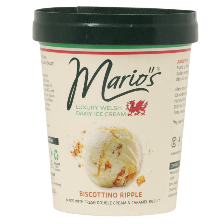 Mario’s Biscottino Ripple Ice Cream is a decadent fusion of creamy indulgence and caramel biscuit bliss. Crafted in Wales with fresh double cream and milk from an award-winning Carmarthenshire dairy f…