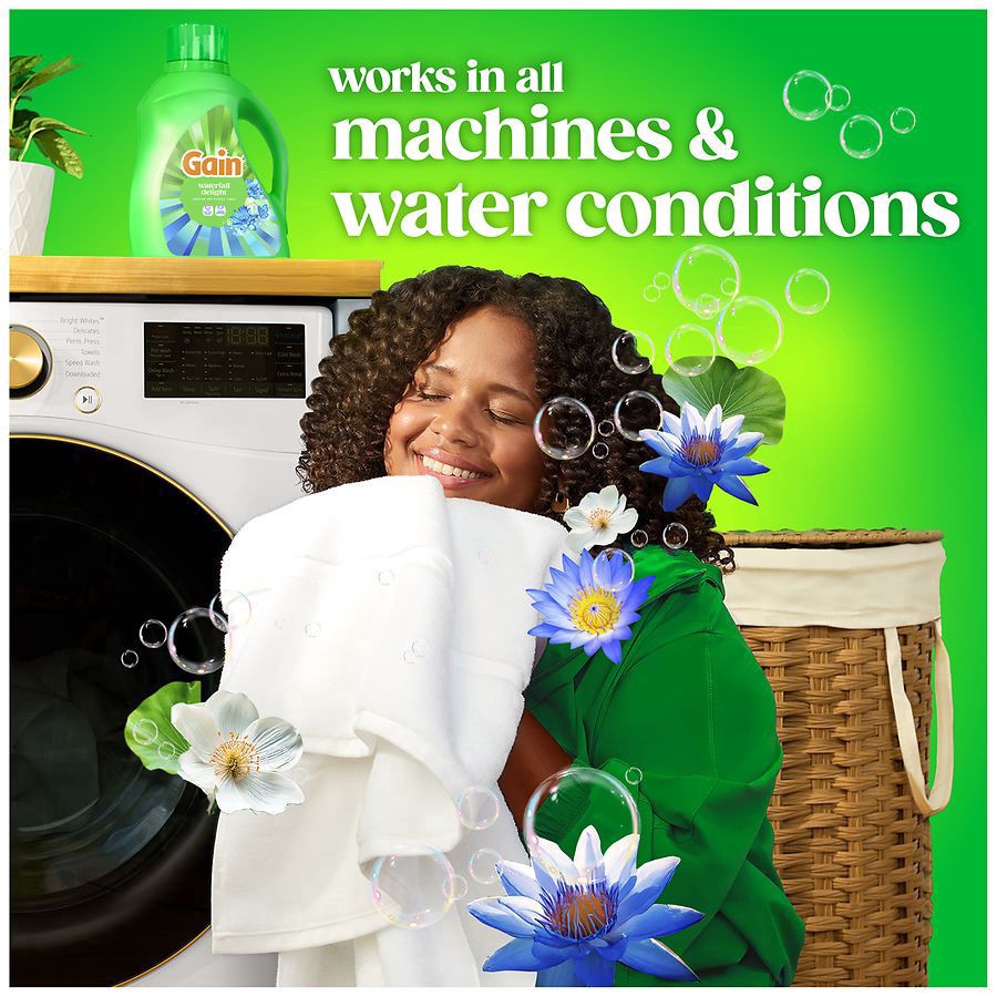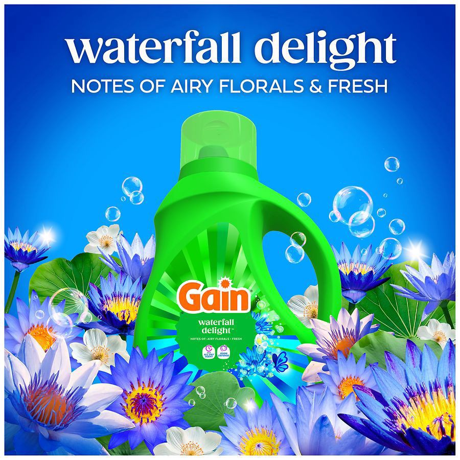 Gain Liquid Laundry Detergent in Waterfall Delight scent brings a serene fragrance that combines the lightness of airy florals with the refreshing essence of water, evoking a sense of calm and tranqui…