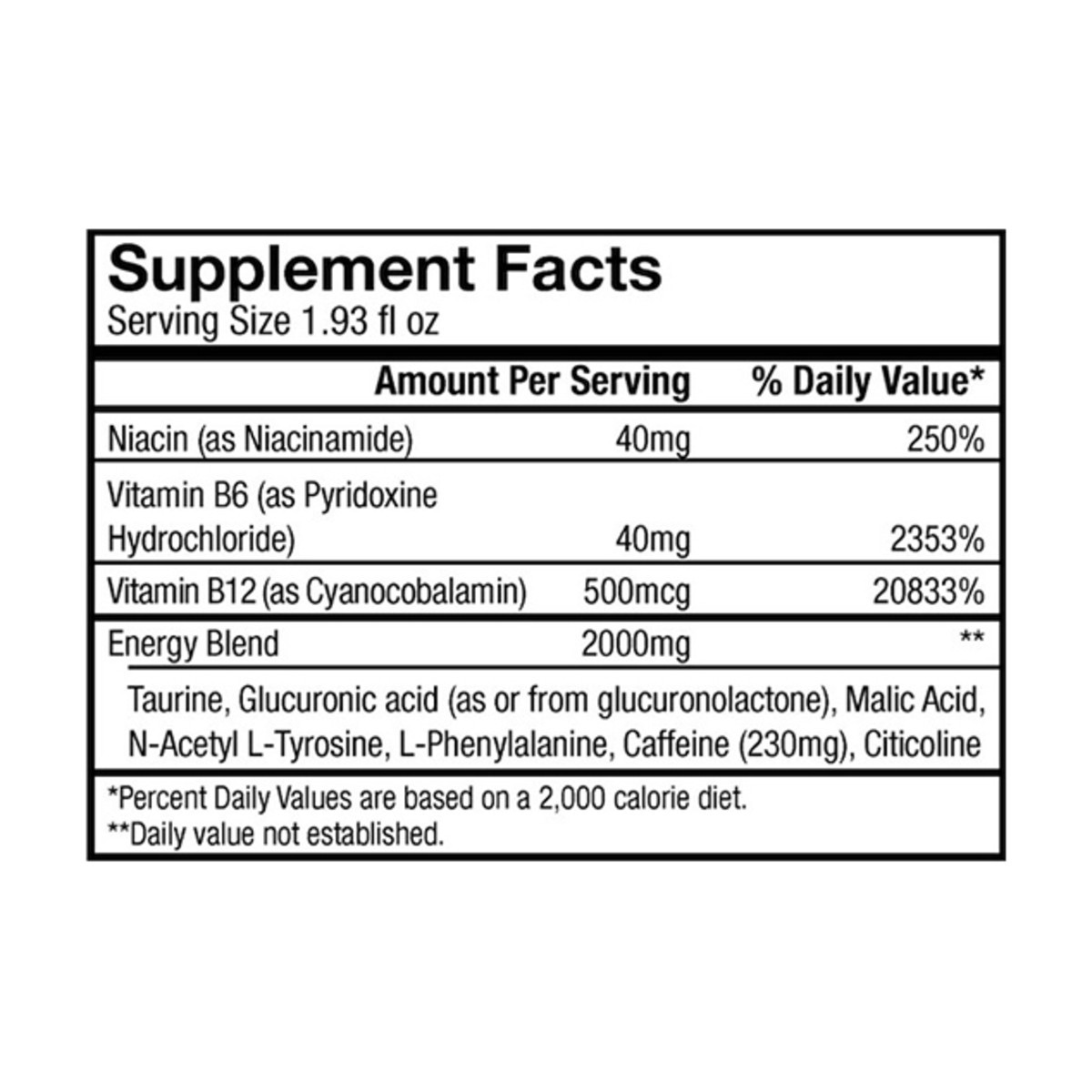 Energy Blend: Taurine, Glucuronic Acid (as or from Glucuronolactone), Malic Acid, N-Acetyl L-Tyrosine, L-Phenylalanine, Caffeine (230Mg), Citicoline. Other Ingredients: Purified Water, Natural and Art…
