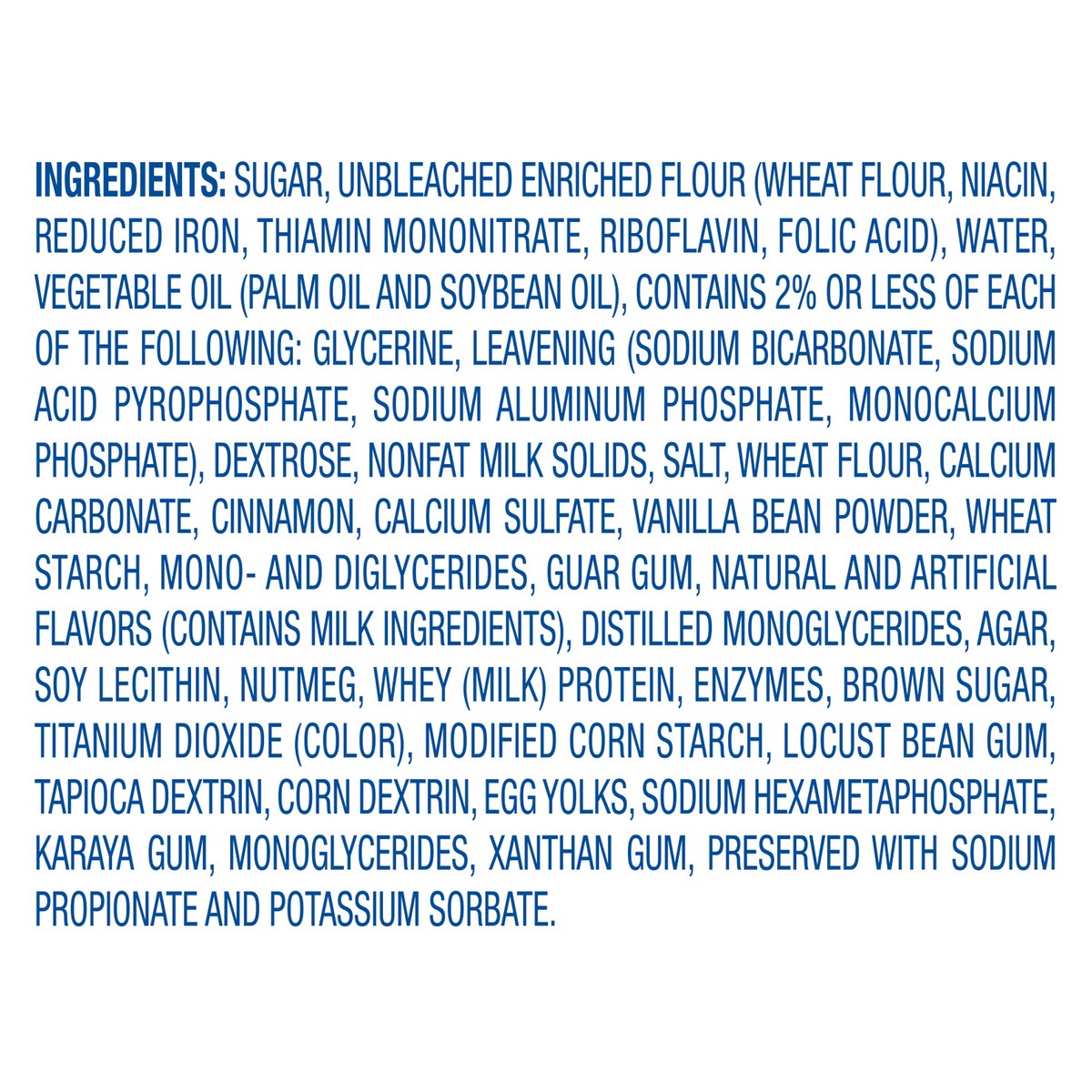 Sugar Unbleached Enriched Flour (Wheat Flour, Niacin Reduced Iron, Thiamin Mononitrate, Riboflavin, Folic Acid), Water Vegetable Oil (Palm Oil and Soybean Oil), Contains 2% or Less of Each of the Foll…