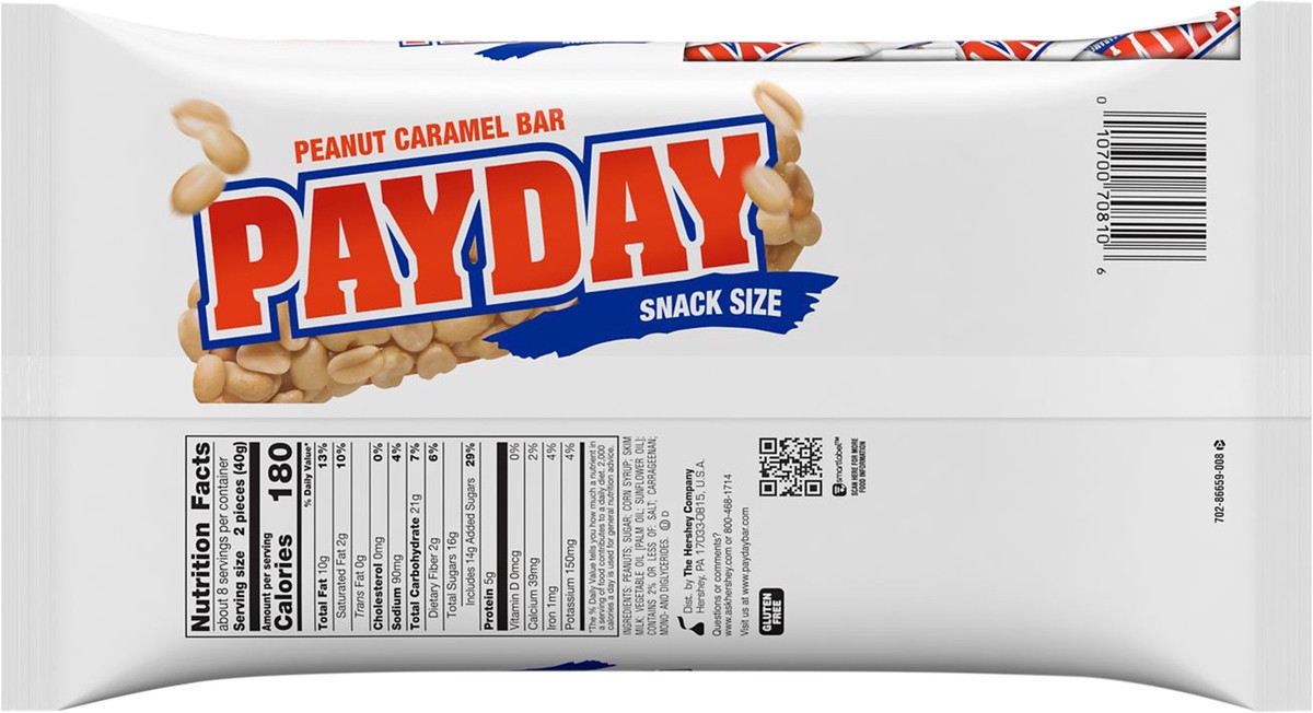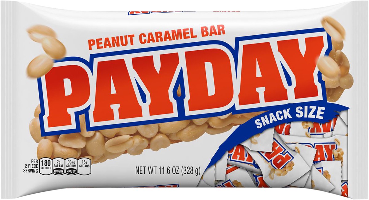 PAYDAY snack-size peanut and caramel candy bars are two-bite versions of the PAYDAY treats you already know and love. These snack-size candies are made with crunchy peanuts and creamy caramel for a ta…
