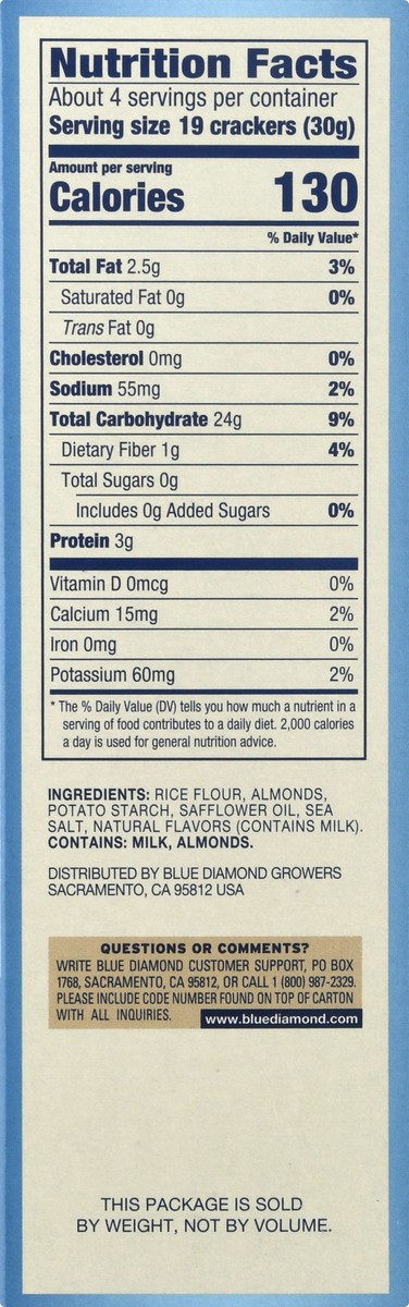 Made with real almonds. Rice cracker snacks with almonds. No artificial flavors. 19 crackers per serving. Certified gluten free. gfco.org. No wheat or gluten. New look same great taste! Hit the spot w…
