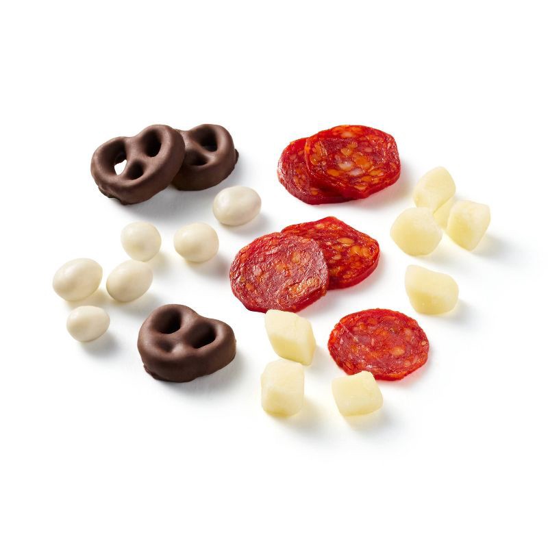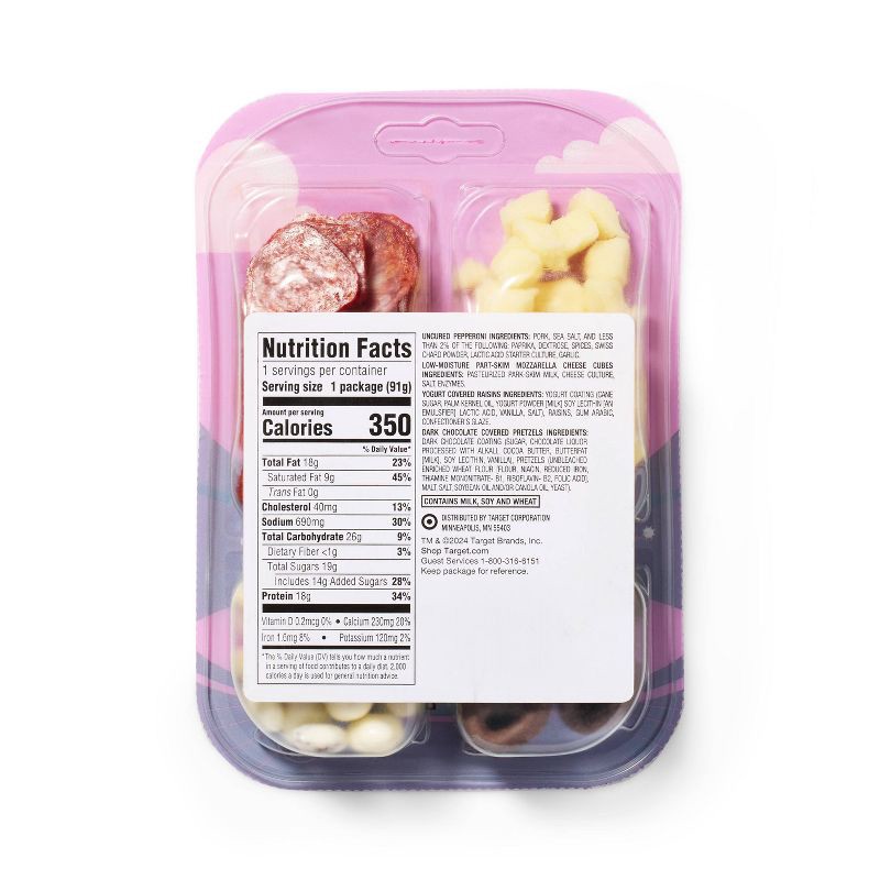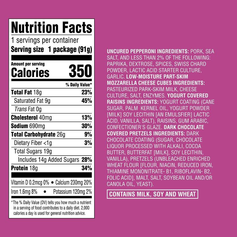 - Includes uncured pepperoni, mozzarella cheese, yogurt covered raisins, & dark chocolate covered pretzels