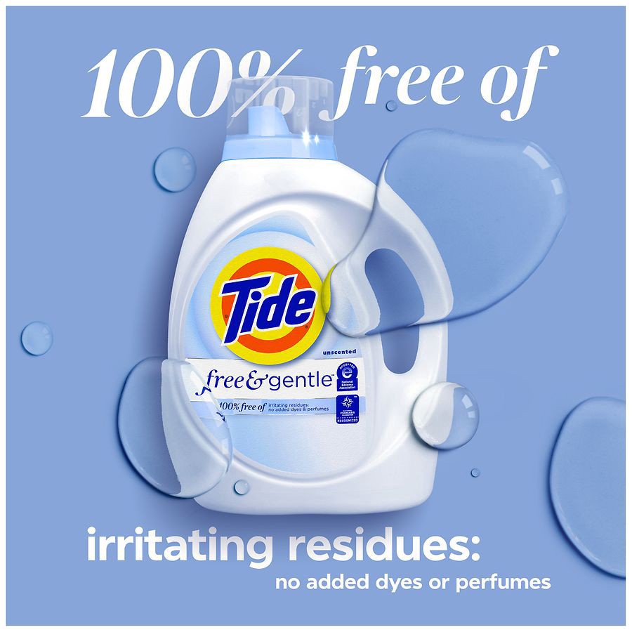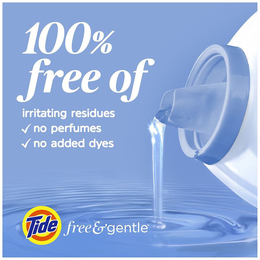 Tide Free & Gentle laundry detergent liquid is the perfect solution for families seeking a trusted, gentle laundry detergent that is 100% free of irritating residues: no added dyes and perfumes. Speci…