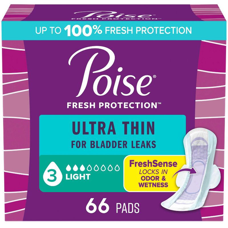 Poise Ultra Thin Incontinence Pads with Wings for Women - Light Absorbency - 3 Drop - Regular - 66ct