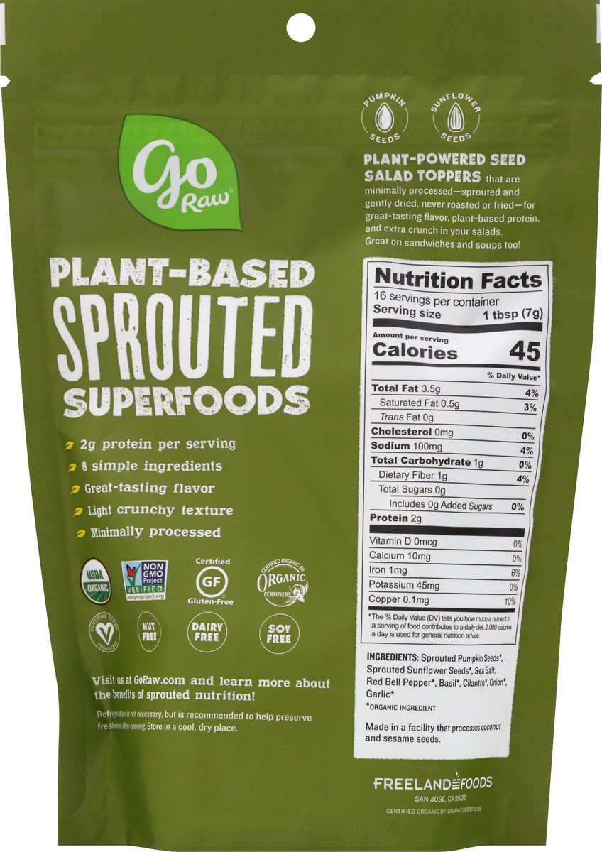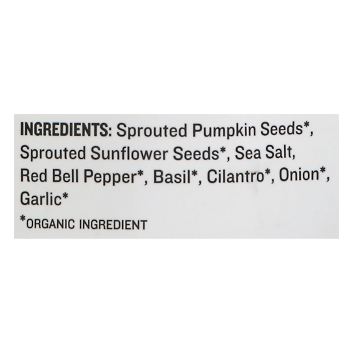 Sprouted Pumpkin Seeds (Organic Ingredient), Sprouted Sunflower Seeds (Organic Ingredient), Sea Salt, Red Bell Pepper (Organic Ingredient), Basil (Organic Ingredient), Cilantro (Organic Ingredient), O…