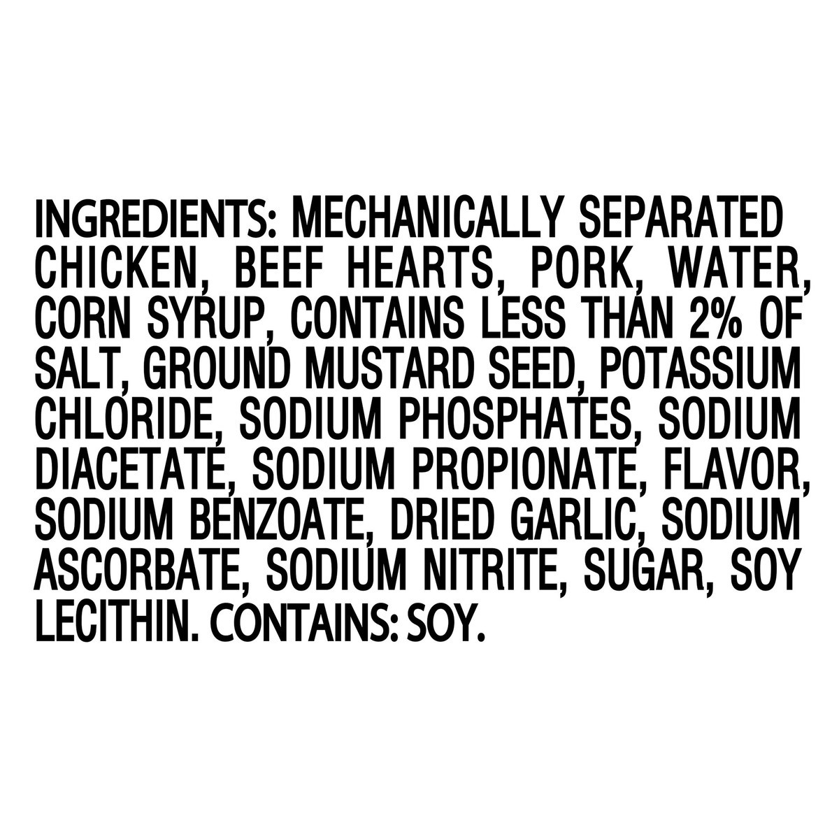 Mechanically Separated Chicken, Beef Hearts, Pork, Water, Corn Syrup, Contains Less than 2% of Salt, Ground Mustard Seed, Potassium Chloride, Sodium Phosphates, Sodium Diacetate, Sodium Propionate, Fl…