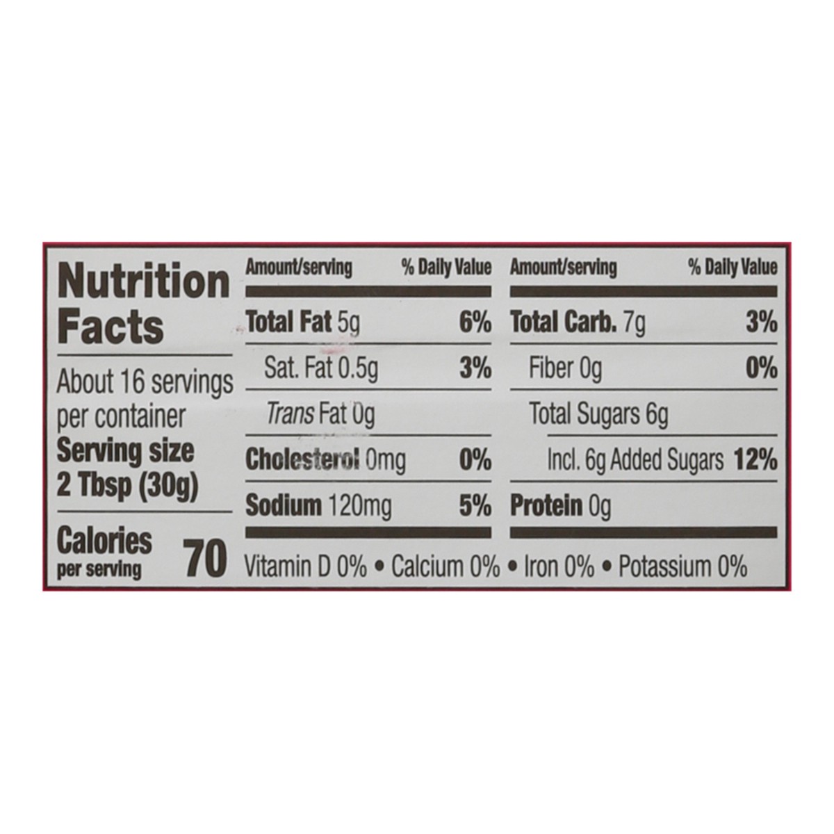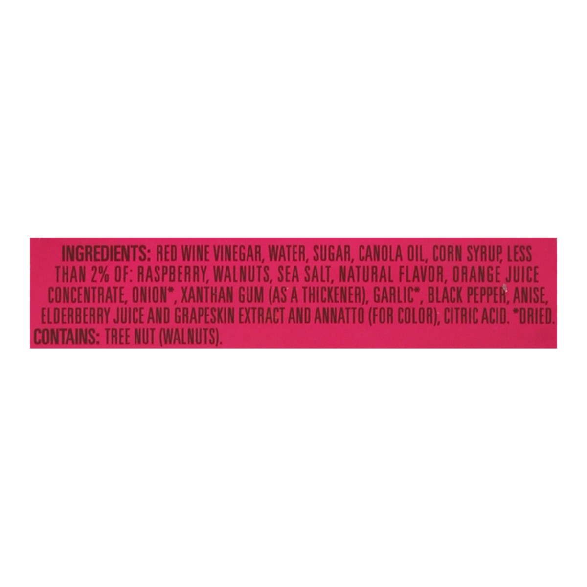Red Wine Vinegar, Water, Sugar, Canola Oil, Corn Syrup, Less than 2% of: Raspberry, Walnuts, Sea Salt, Natural Flavor, Orange Juice Concentrate, Onion (Dried), Xanthan Gum (as a Thickener), Garlic (Dr…