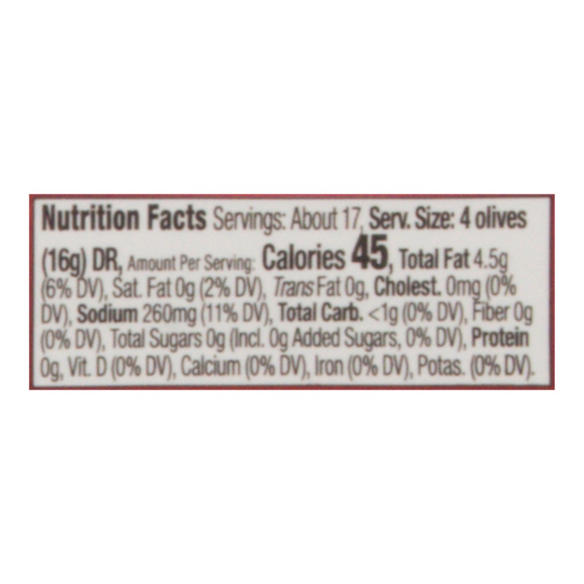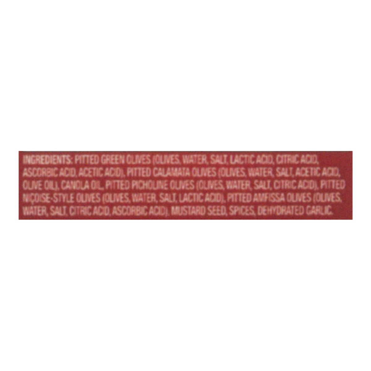 Pitted Green Olives (Olives, Water, Salt, Lactic Acid, Citric Acid, Ascorbic Acid, Acetic Acid), Pitted Calamata Olives (Olives, Water, Salt, Acetic Acid, Olive Oil), Canola Oil, Pitted Picholine Oliv…