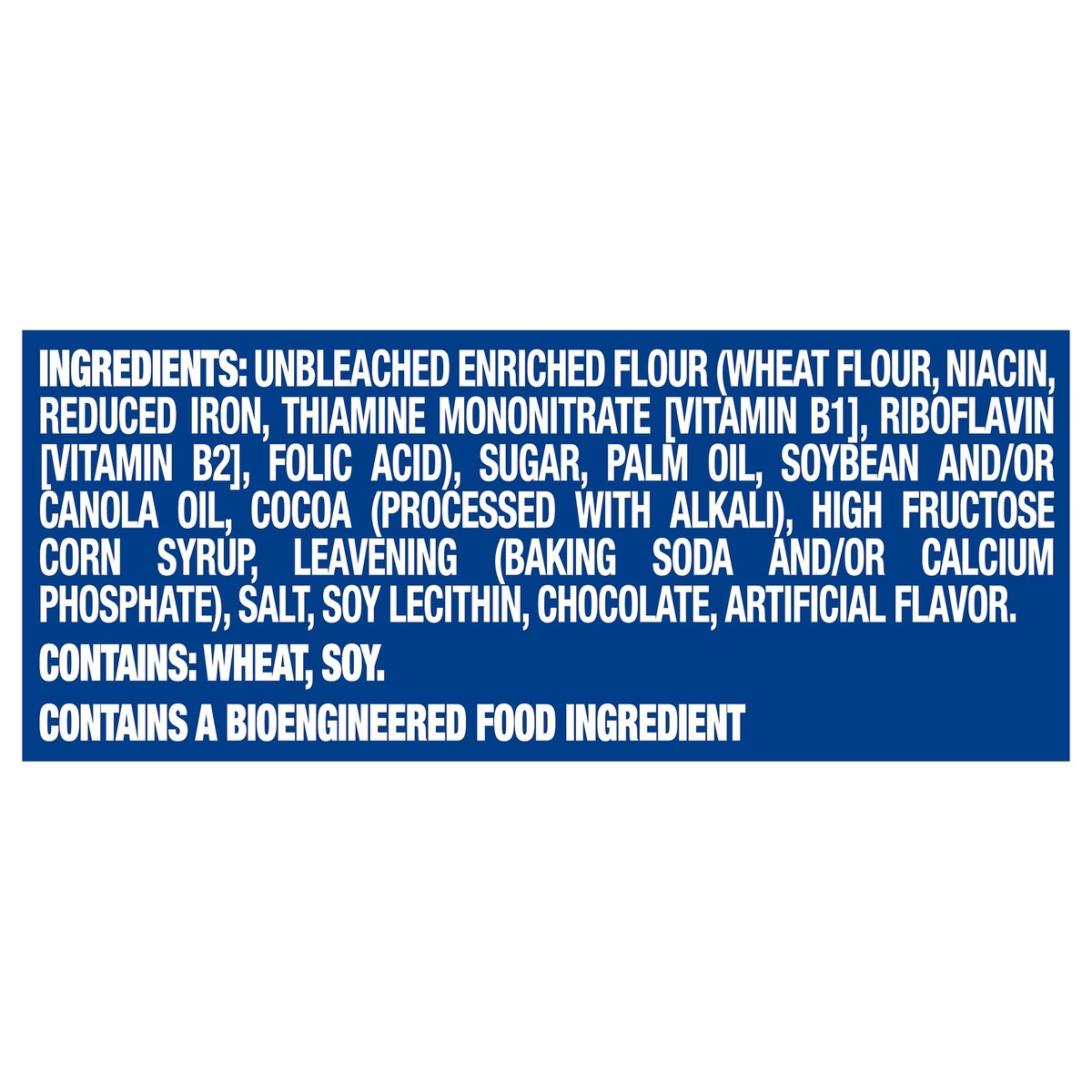 INGREDIENTS: UNBLEACHED ENRICHED FLOUR (WHEAT FLOUR, NIACIN, REDUCED IRON, THIAMINE MONONITRATE [VITAMIN B1], RIBOFLAVIN [VITAMIN B2], FOLIC ACID), SUGAR, PALM OIL, SOYBEAN AND/OR CANOLA OIL, COCOA (P…