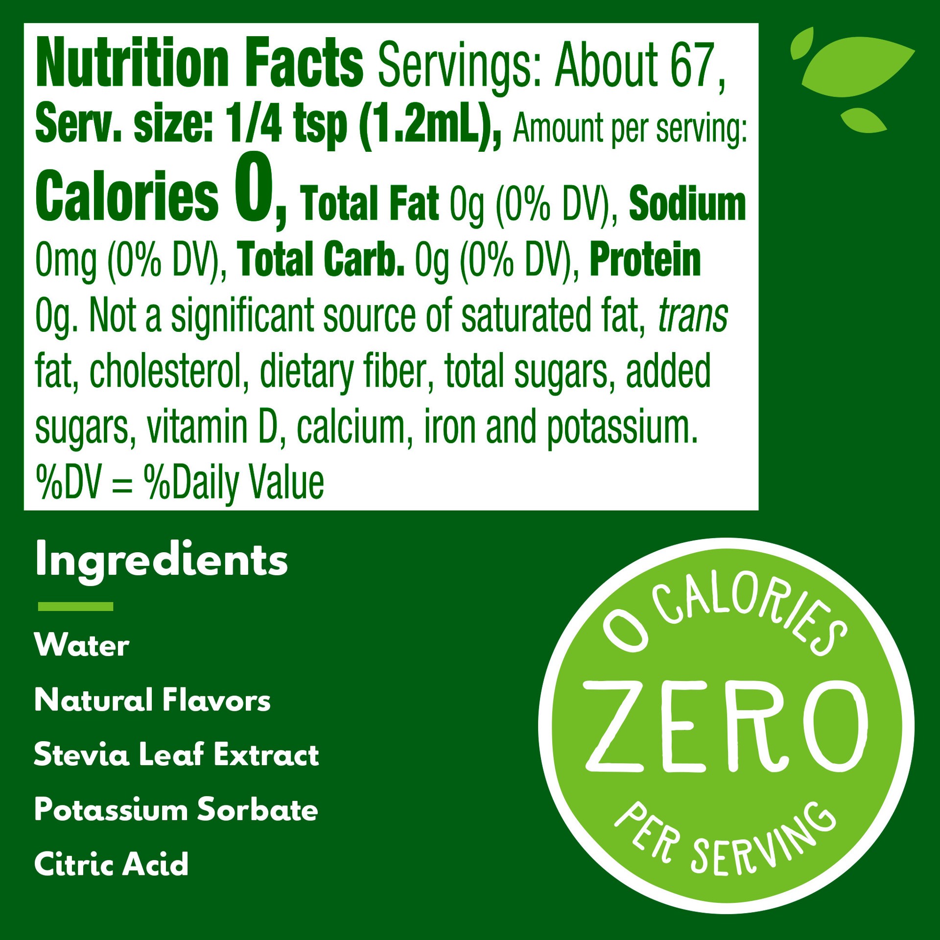 Water, natural flavors, stevia leaf extract, potassium sorbate, and citric acid