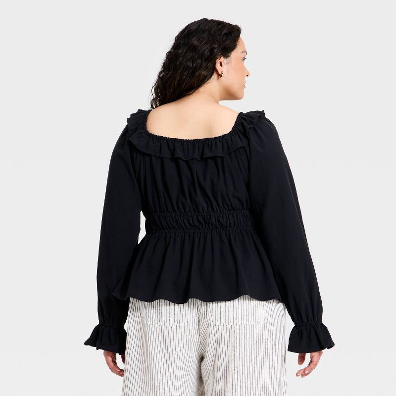 Women's Plus Balloon Long Sleeve V-Neck Frill Woven Top - Ava & Viv™ Black 3X