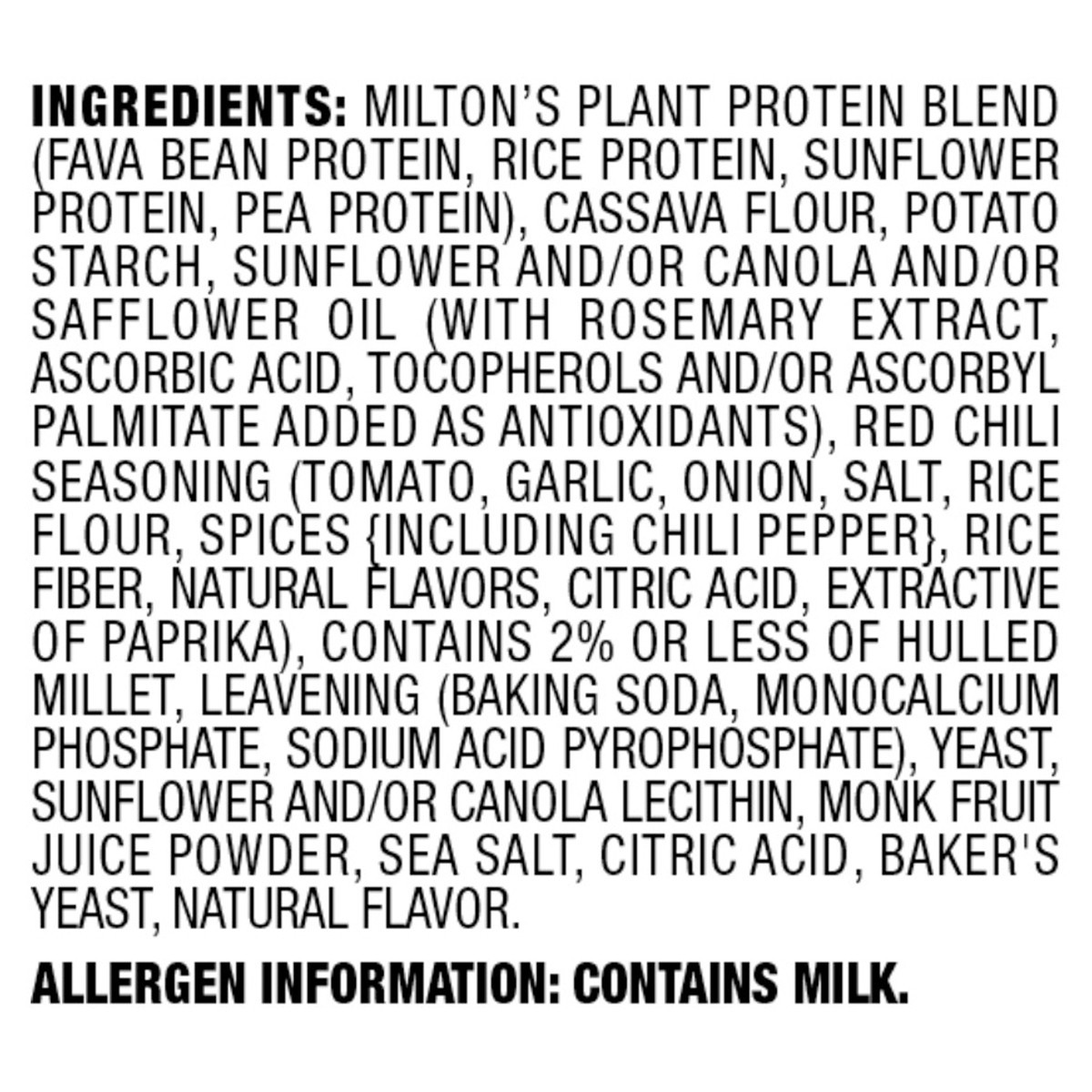 Milton's Plant Protein Blend (Fava Bean Protein, Rice Protein, Sunflower Protein, Pea Protein), Cassava Flour, Potato Starch, Sunflower and/or Canola and/or Safflower Oil (with Rosemary Extract, Ascor…