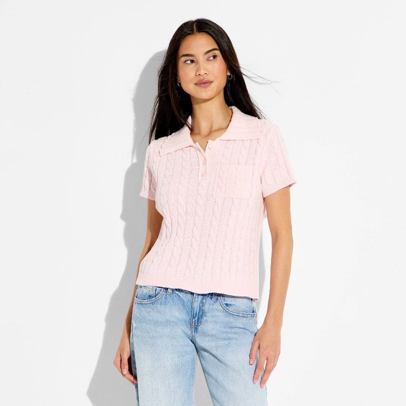 Women's Short Sleeve Cable Polo Pullover Sweater - Wild Fable™ Pink XXS