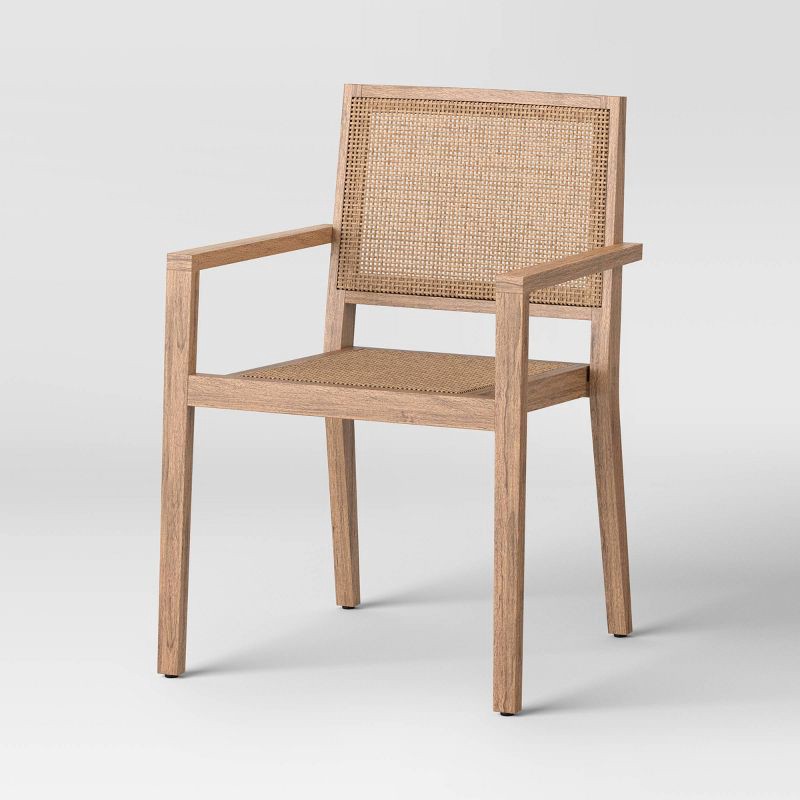 Sit back and relax outdoors with this Wood Caning Stackable Patio Chair from Threshold™ designed with Studio McGee. This wooden patio chair features fixed arms and a woven caning seat and back to prov…