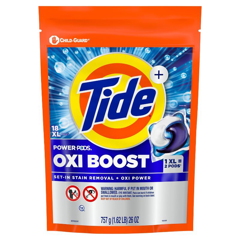 - Includes one 18 Count pack of Tide Oxi Boost Power PODS Laundry Detergent, Laundry Pods with Advanced Stain Removal plus Oxi Power