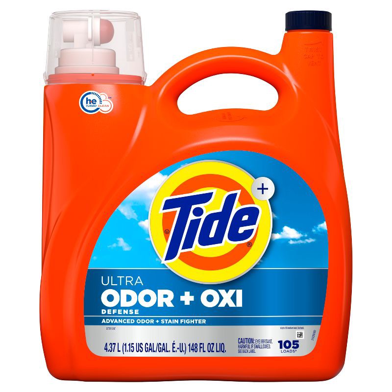 - Includes one 148 fl oz bottle of Tide Ultra Odor Defense Plus Oxi Liquid Laundry Detergent with Advanced Odor and Stain Fighters, enough for 105 loads
