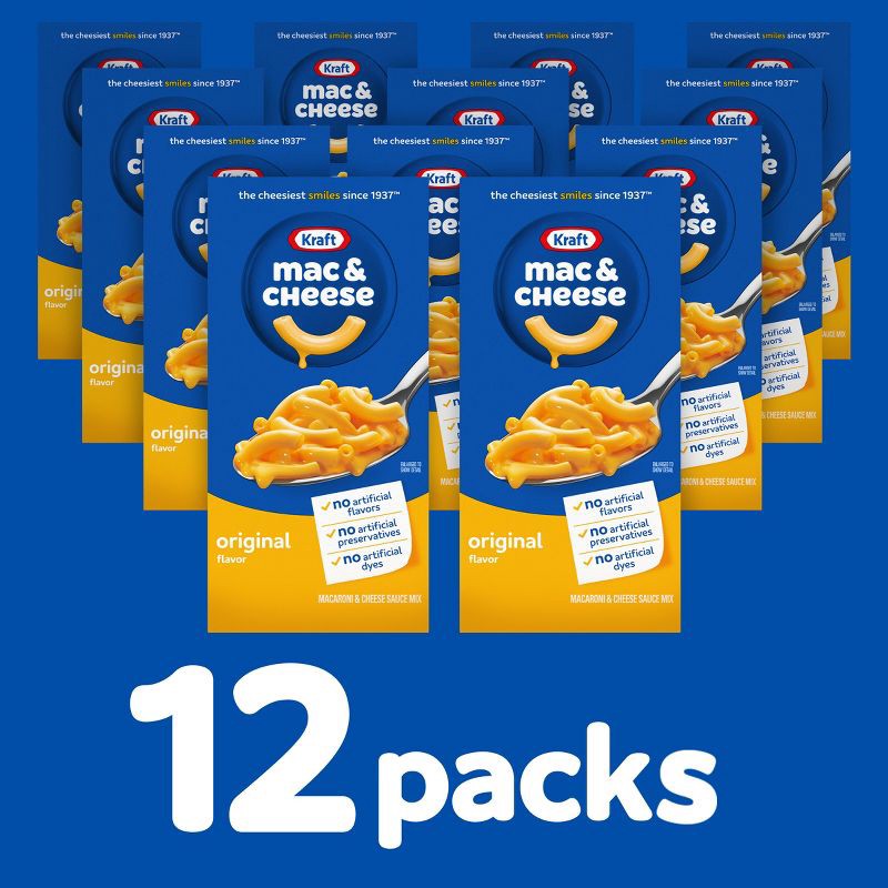 - KRAFT MAC AND CHEESE: Twelve 7.25 oz boxes of Kraft Original Mac & Cheese Macaroni and Cheese Dinner