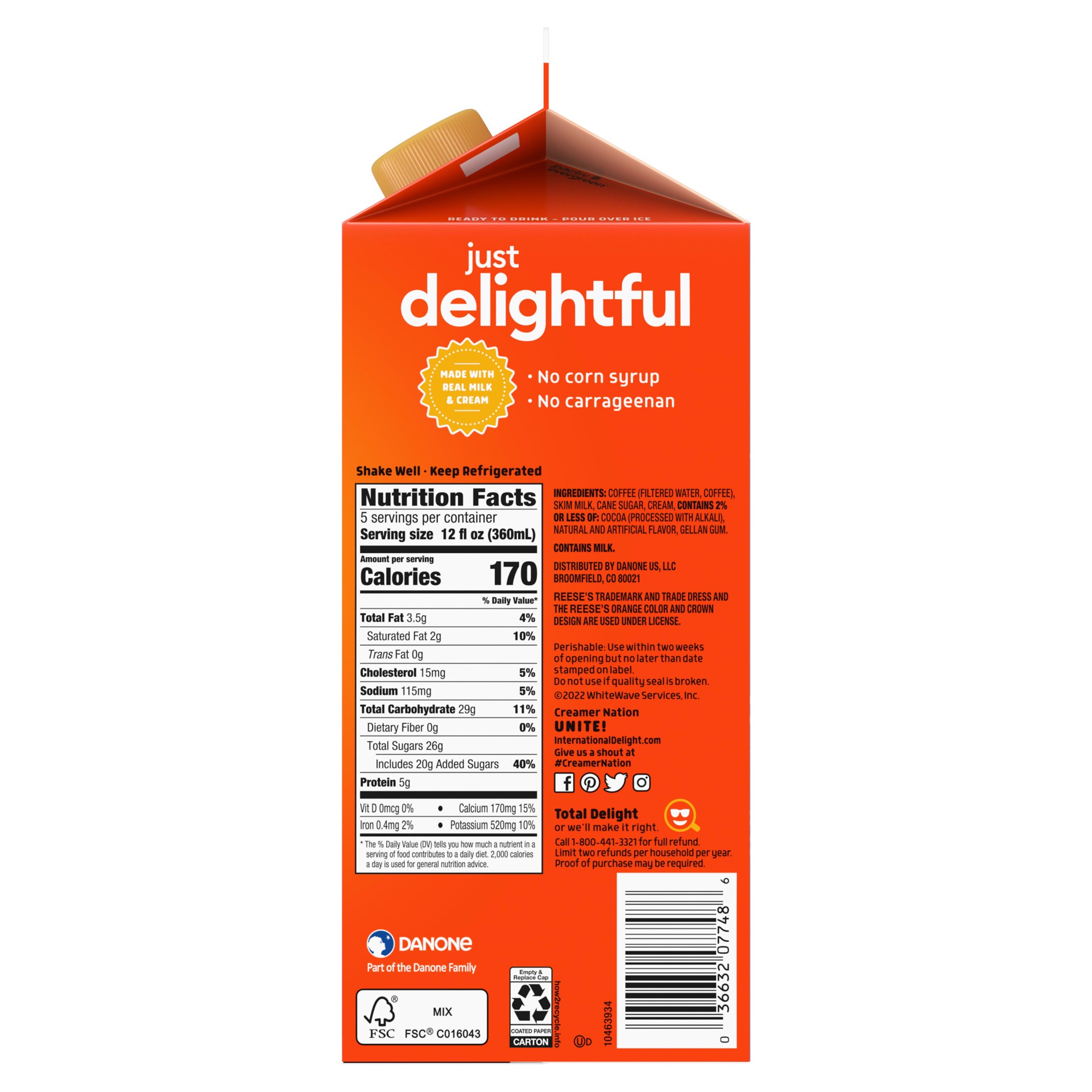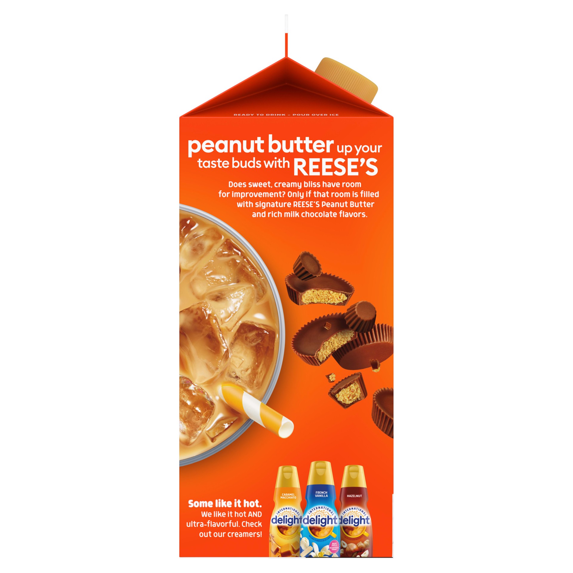 - Coffeehouse at Home: One 64 fl oz carton of International Delight REESE’S Iced CoffeeReal Ingredients: Iced coffee made with real milk, cream and cane sugarPeanut Butter Creaminess: Sweet, creamy bliss with the smooth flavor of REESE''S Peanut Butter Cups for a coffee iced and ready for your cup, plus you can add your favorite International Delight Creamer to perfect your coffee breakAny Season, Any Reason: Coffee and creamy in sweet harmony – the perfect ready to drink chocolate peanut butter iced coffee straight from your fridgeParty on Ice: Just keep this carton in your fridge, add ice and enjoy coffee drinks whenever and wherever the party is happening