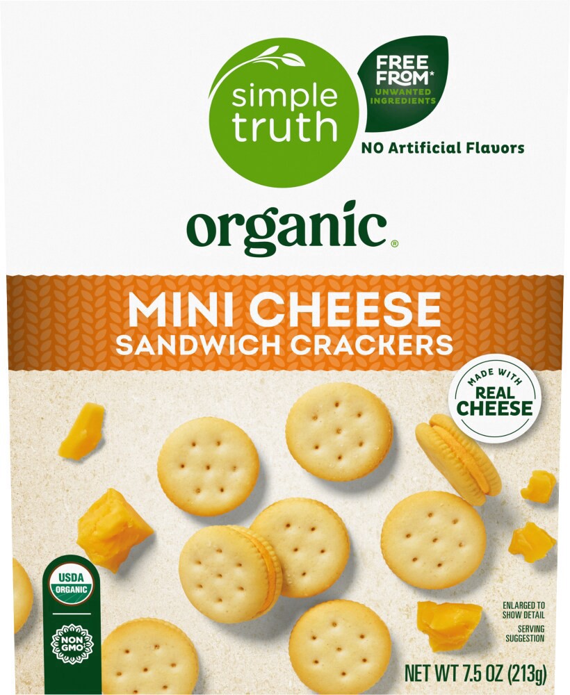 Simple Truth Organic® Mini Cheese Sandwich Crackers are a mouthwatering blend of organic wheat flour, creamy cheddar cheese filling, and just a touch of organic cane sugar. Savory cheddar cheese is ne…