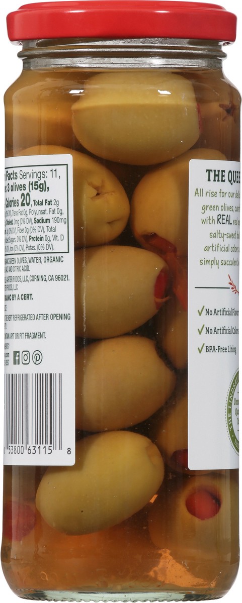 Deliciously tart organic green olives, hand-stuffed with real red pepper for a perfect salty-sweet balance.