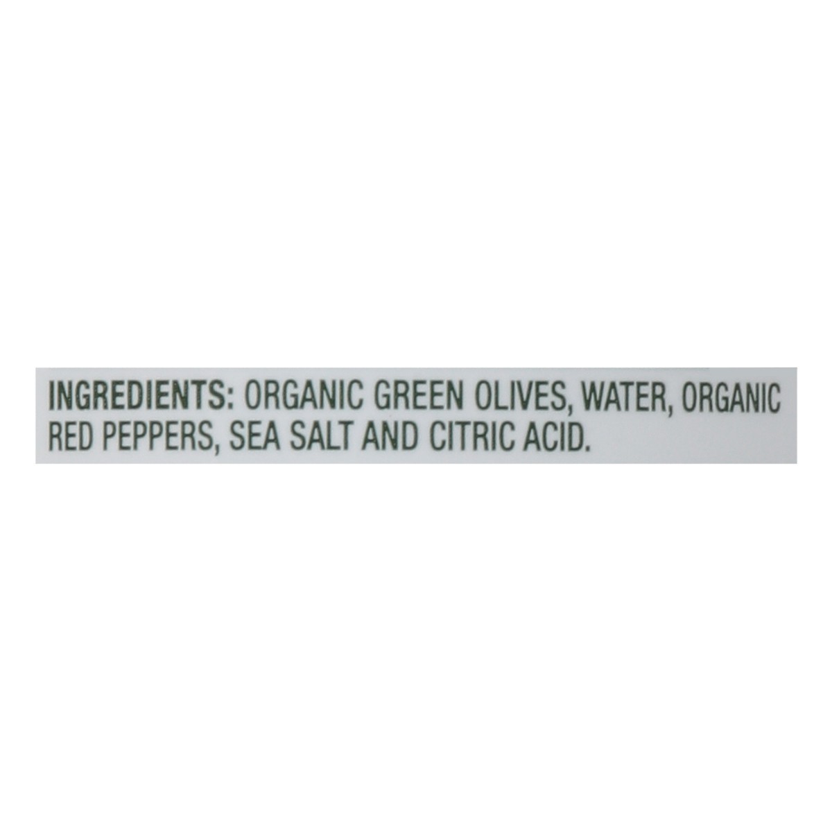 Organic Green Olives\, Water\, Organic Red Peppers\, Sea Salt and Citric Acid.