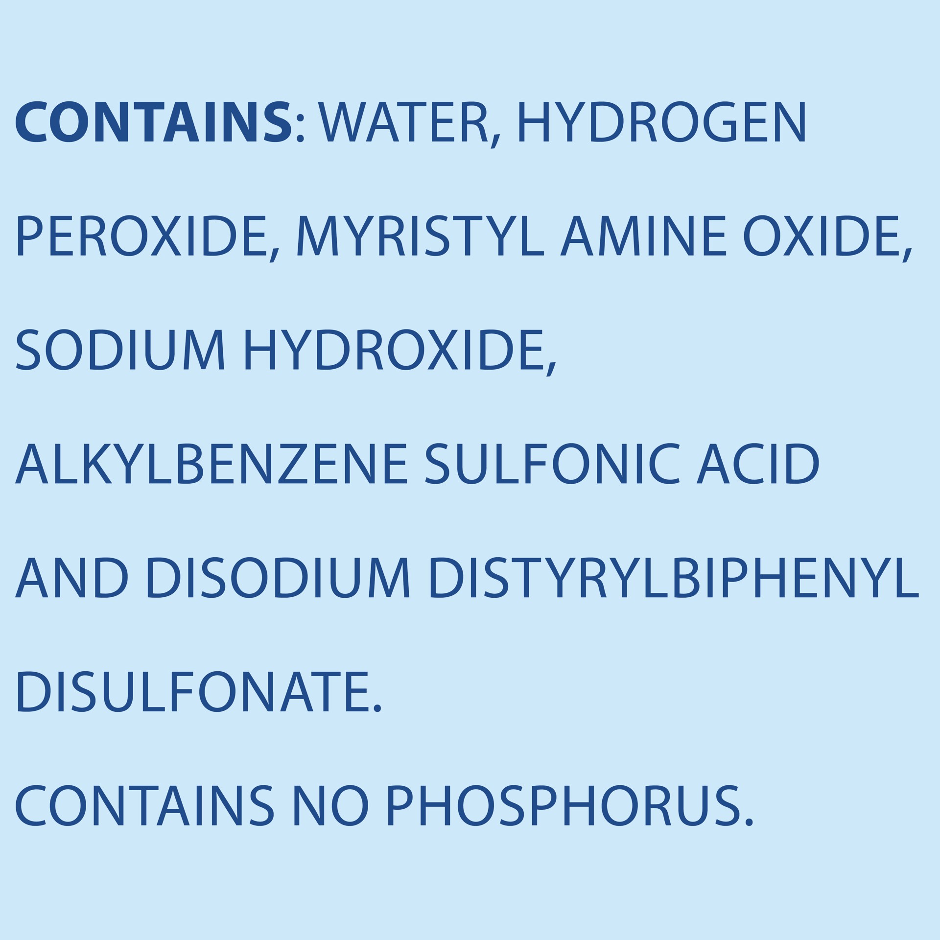 Contains: Water, Hydrogen Peroxide, Myristyl Amine Oxide, Sodium Hydroxide, Alkylbenzene Sulfonic Acid and Disodium Distyrylbiphenyl Disulfonate.