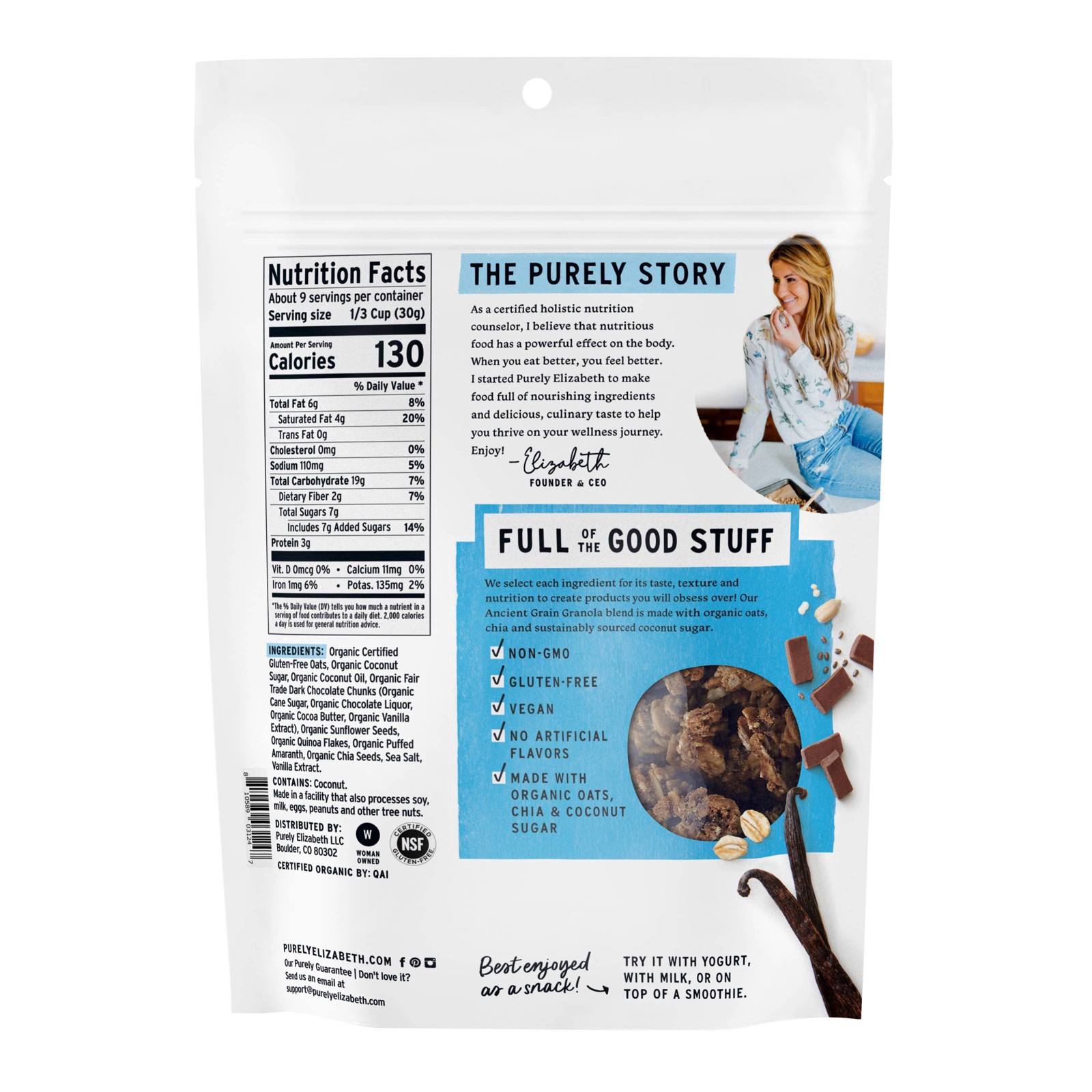 Purely Elizabeth Vanilla Chocolate Chip Ancient Grain Granola is crafted with a blend of organic ancient grains and superfood seeds, with hints of vanilla and fair-trade dark chocolate chunks, for sal…