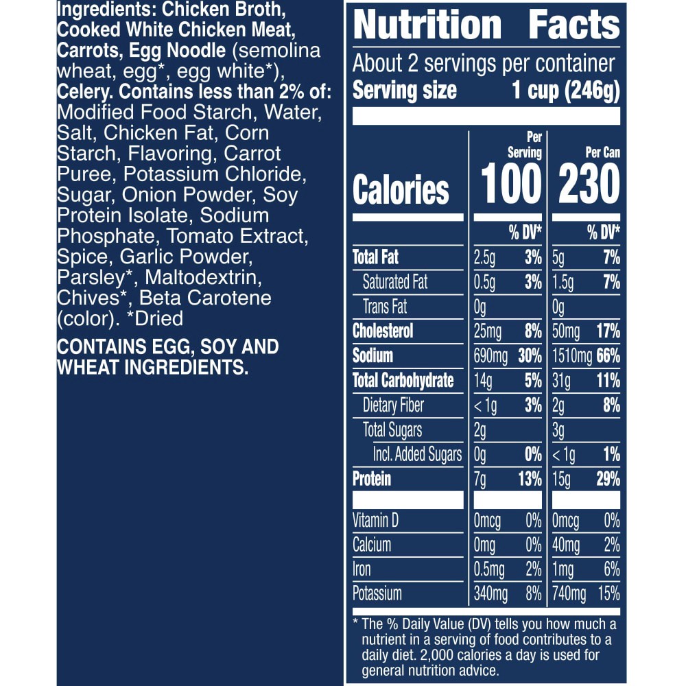 CHICKEN BROTH, COOKED WHITE MEAT CHICKEN, CARROTS, EGG NOODLE (SEMOLINA WHEAT, EGG*), CELERY. CONTAINS LESS THAN 2% OF: WATER, MODIFIED FOOD STARCH, CHICKEN FAT, SALT, CORN STARCH, CARROT PUREE, EGG W…