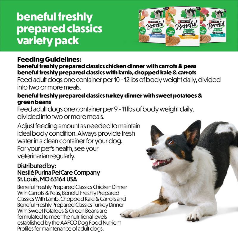 - Made with Real Protein: Purina Beneful Freshly Prepared Classics Variety Pack with Chicken, Turkey, or Lamb Dog Food is made fresh with quality ingredients and steam cooked to lock in flavor.