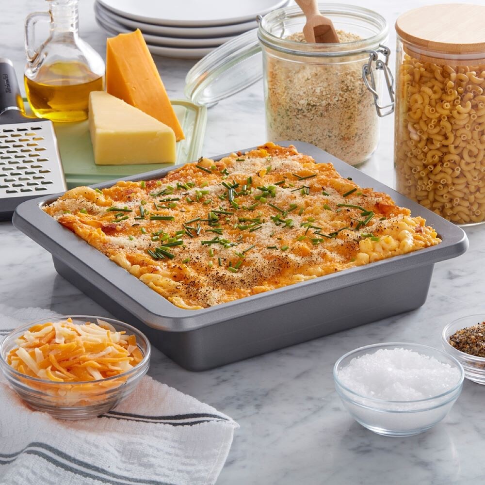 Perfect for baking square layer cakes, macaroni and cheese, casseroles and quichesExtended handles provide a secure grip for easy transportDishwasher safe