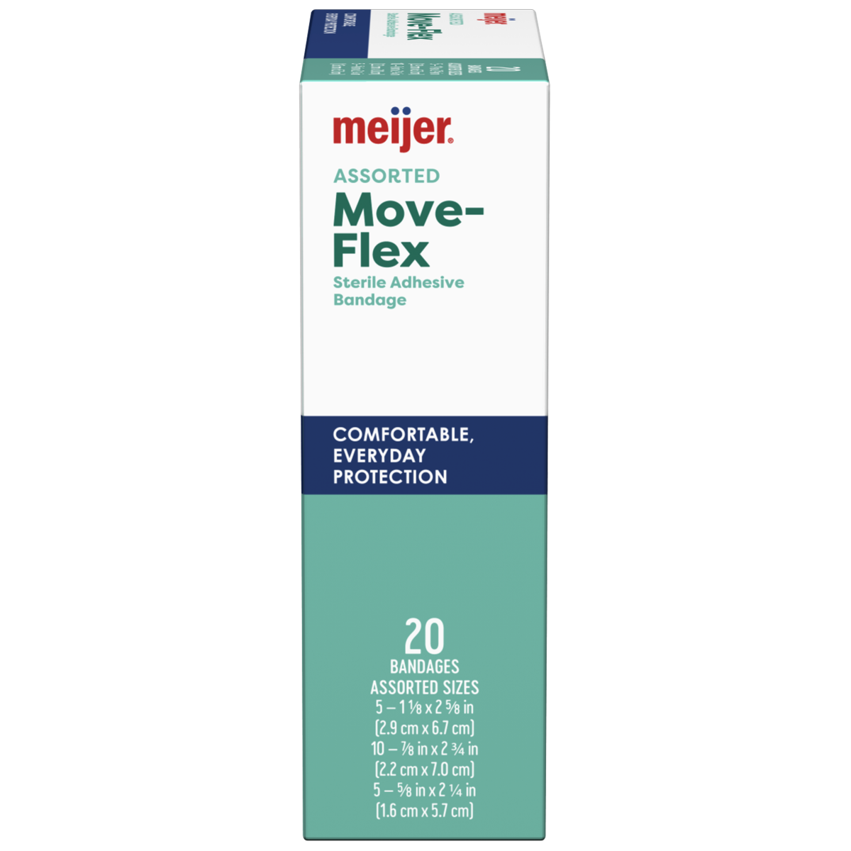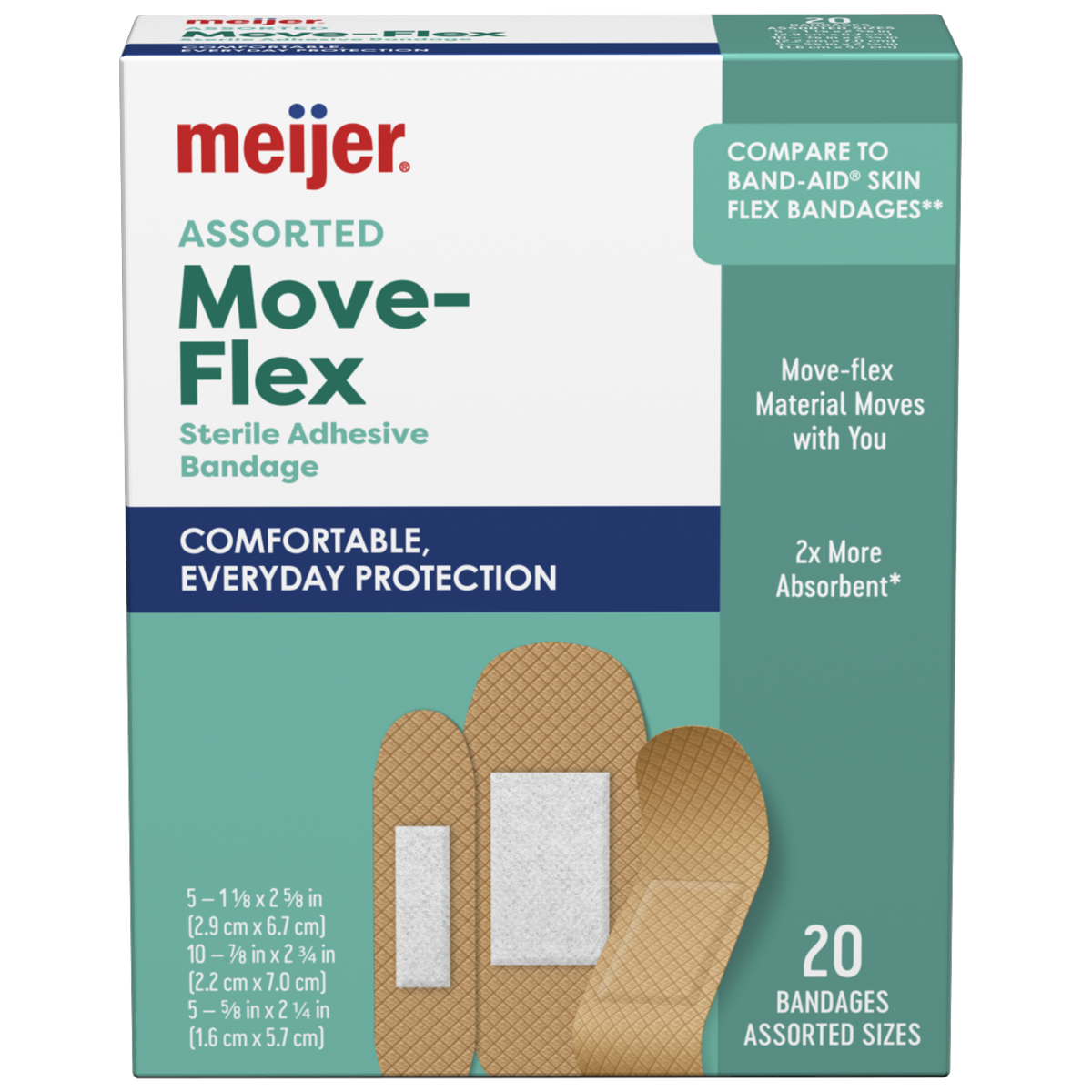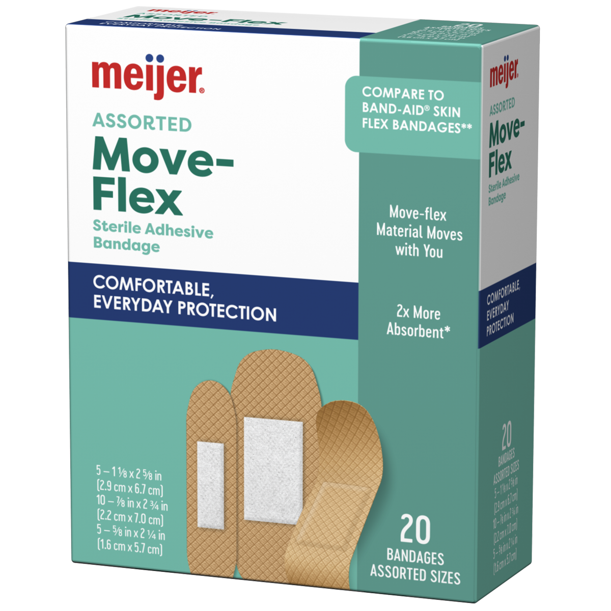Meijer Move-Flex Adhesive Bandages are designed for comfort and flexibility. They're made with eight times more flexibility that moves with you, so the bandage stays in place throughout the day to cov…