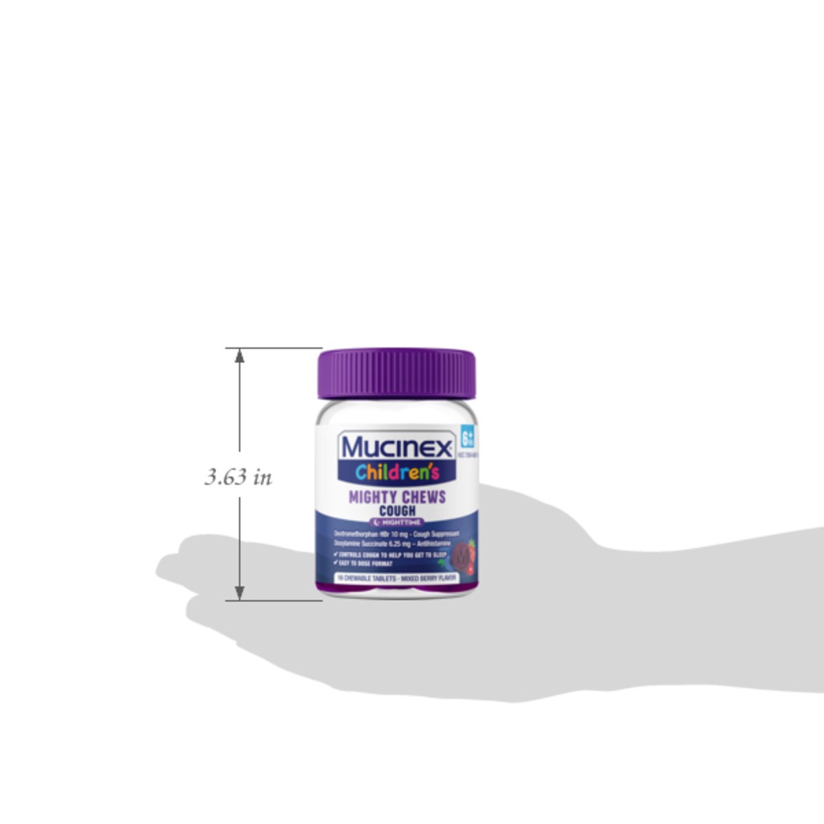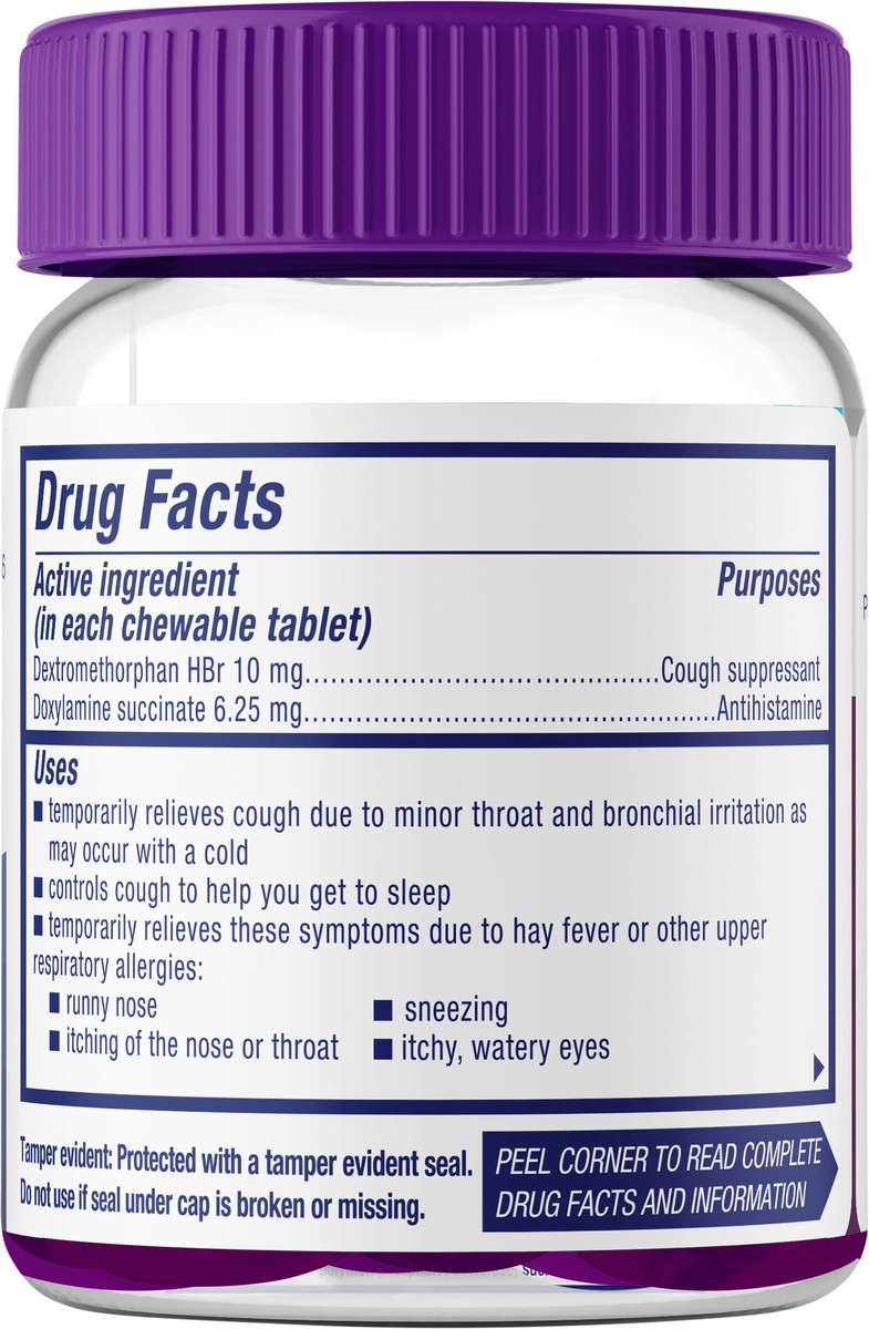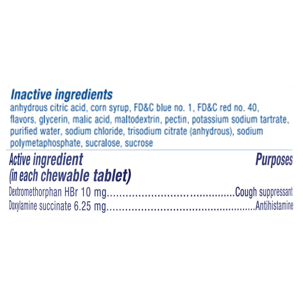 In Each Chewable Tablet: Active Ingredients: Dextromethorphan HBR (10 mg), Cough Suppressant; Doxylamine Succinate (6.25 mg), Antihistamine. Inactive Ingredients: Anhydrous Citric Acid, Corn Syrup, FD…