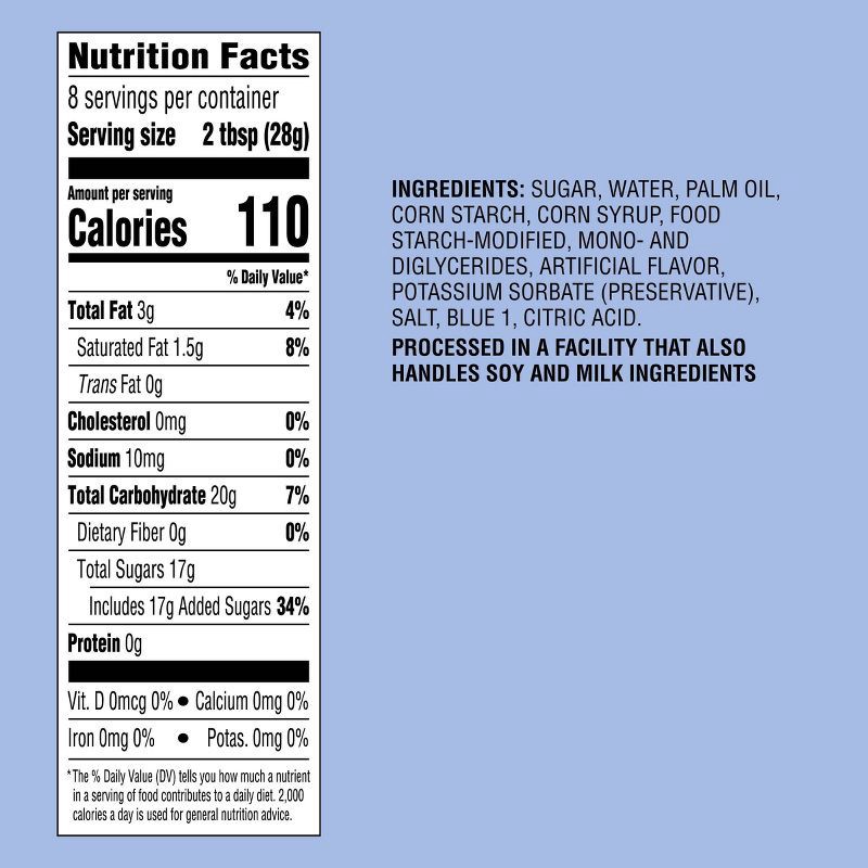 SUGAR, WATER, PALM OIL, CORN STARCH, CORN SYRUP, FOOD STARCH-MODIFIED, MONO- AND DIGLYCERIDES, ARTIFICIAL FLAVOR, POTASSIUM SORBATE (PRESERVATIVE), SALT, BLUE 1, CITRIC ACID.