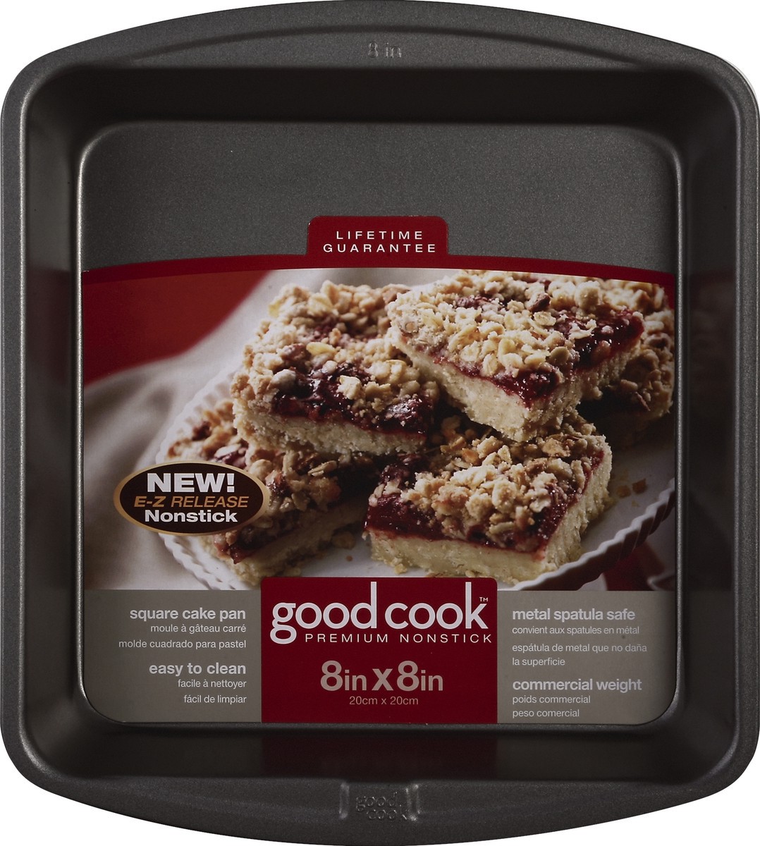20 cm x 20 cm. Premium nonstick. Lifetime guarantee. New! E-Z release nonstick. Easy to clean. Metal spatula safe. Commercial weight. Thank you for choosing our Good Cook baking pan. Good Cook product…