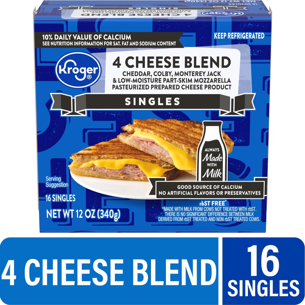 Kroger® Singles 4 Cheese Blend Sliced Cheese bring the flavors of Colby, cheddar, Monterey jack, and mozzarella together in one convenient slice. This tasty blend, with no artificial flavors or preser…