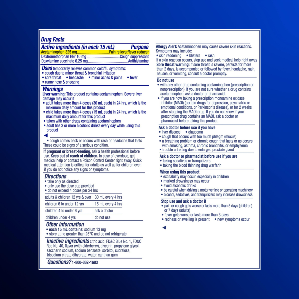 In Each 15 mL: Active Ingredients: Acetaminophen (325 mg), Pain Reliever/Fever Reducer; Dextromethorphan HBr (10 mg), Cough Suppressant; Doxylamine Succinate (6.25 mg), Antihistamine. Inactive Ingrediā¦
