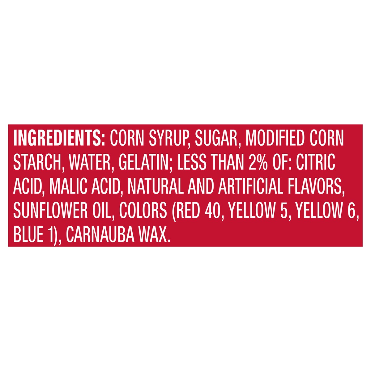 CORN SYRUP, SUGAR, MODIFIEDCORNSTARCH, WATER, GELATIN; LESS THAN 2%OF: CITRIC ACID, MALIC ACID, NATURAL ANDARTIFICIAL FLAVORS, OIL (SUNFLOWER OIL ORMINERAL OIL), COLORS (RED 40, YELLOW 5,YELLOW 6, BLU…