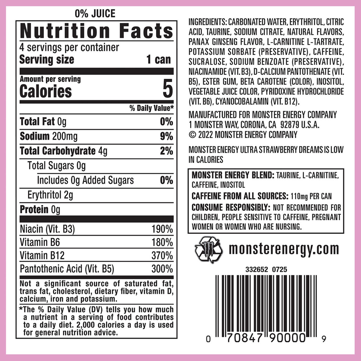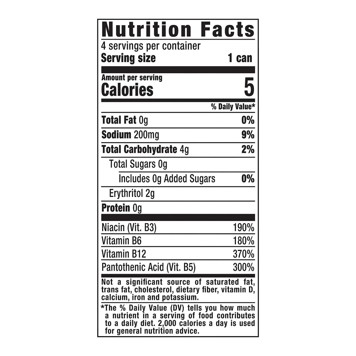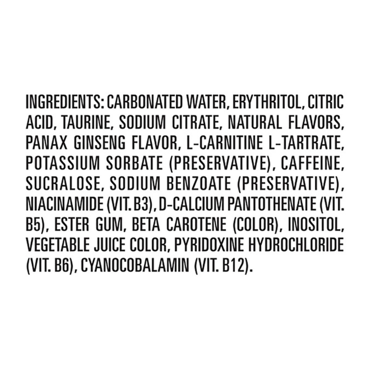 Carbonated Water, Erythritol, Citric Acid, Taurine, Sodium Citrate, Natural Flavors, Panax Ginseng Flavor, L-Carnitine L-Tartrate, Potassium Sorbate (Preservative), Caffeine, Sucralose, Sodium Benzoat…