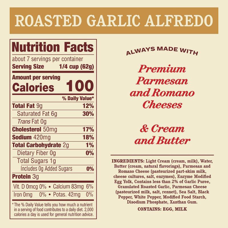 - PREMIUM QUALITY: Rao's Homemade Roasted Garlic Alfredo Sauce is a super creamy, velvety pasta sauce combining cream, Parmesan and Romano cheeses and butter.