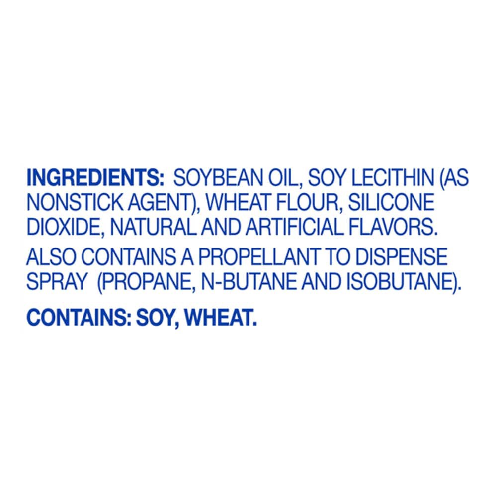 Soybean Oil, Soy Lecithin (As Non-Stick Agent), Wheat Flour, Silicone Dioxide, Natural And Artificial Flavors. Also Contains A Propellant Dispense Spray (Propane, N-Butane And Isobutane)