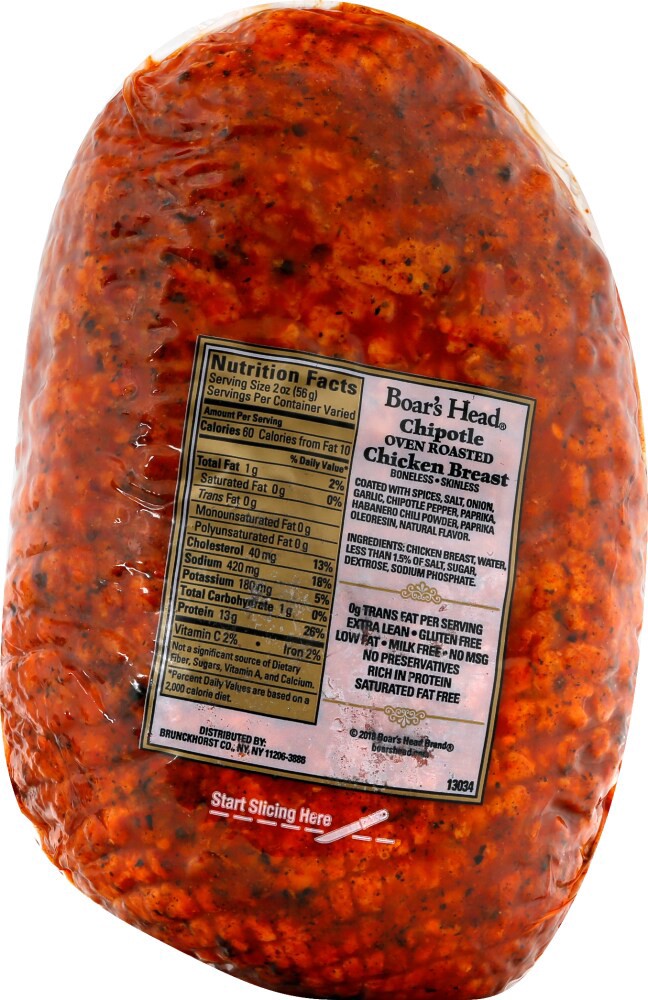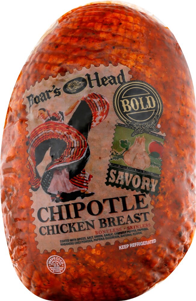 Boars Head Chipotle Chicken ( Chicken Breast , Water , Less Than 1 . 5% Of : Salt , Sugar , Dextrose , Sodium Phosphate , Coated With : Spices , Salt , Onion , Garlic , Chipotle Pepper , Paprika , Hab…